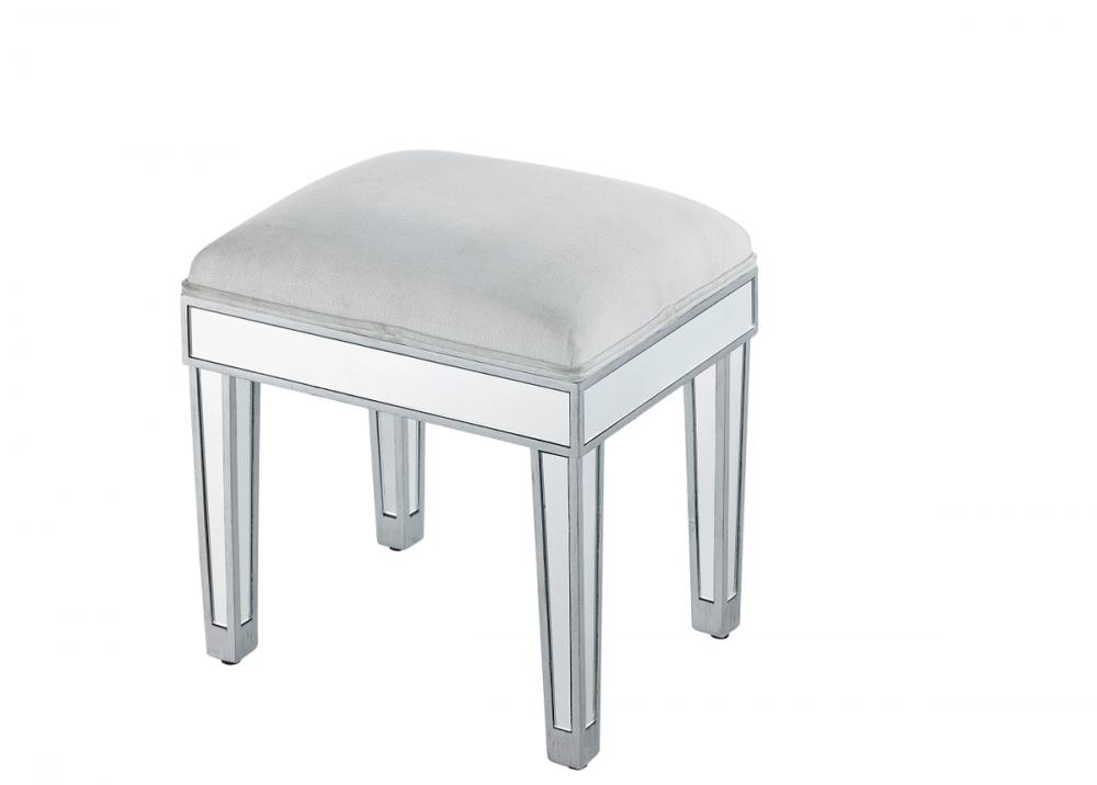 Stylish and versatile, this upholstered stool is perfect for use with a dressing table, desk, coffee table, or a small ottoman. Measuring L18xW14xH18”, this stool is covered by linen and cotton blend fabric, adding a velvety softness and comfort. FEATURES: *Reflexion collection Upholstered with cotton and linen blend *Hand rubbed silver finish *Top-quality mirror panel *Solid wood trim and legs PRODUCT DETAILS: Measurement L18xW14xH18” *Minor assembly required *Material in kiln-dried solid wood and engineered wood * 1 year limited warranty.