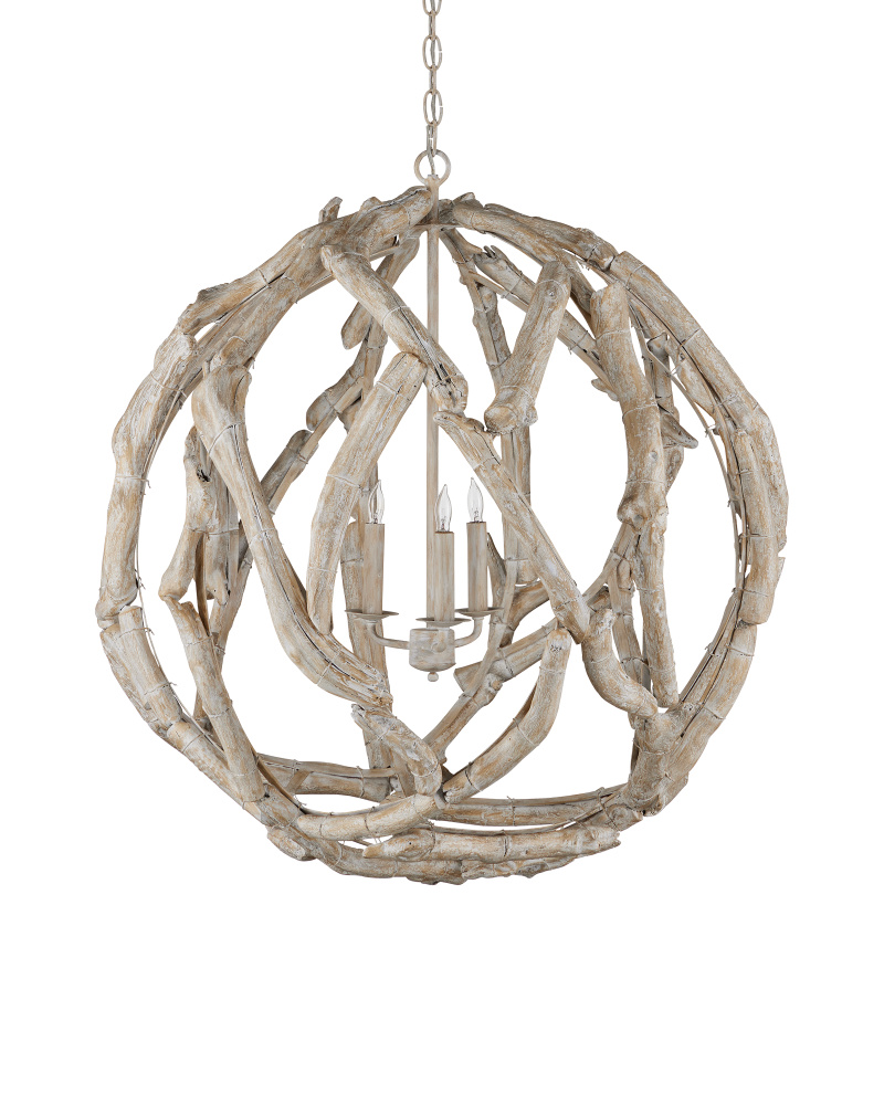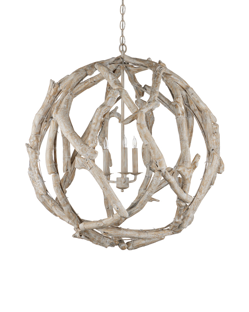 The Driftwood Whitewash Orb Chandelier is crafted from hand-selected pieces of natural driftwood. The wrought iron frame and the wood pieces are in a whitewashed driftwood finish that makes this a seamless tone-on-tone composition. The Driftwood is a perfect choice for any home with coastal or lakeside aesthetics. Adjustable from 37.5" to 105.5" with use of included chain/rod kit/cable. If your space calls for a longer drop, additional chain/rods/cable is available for purchase.