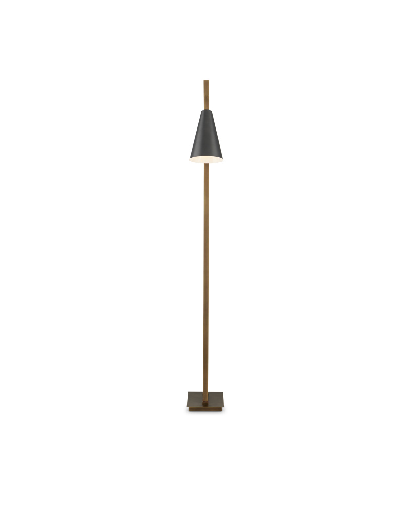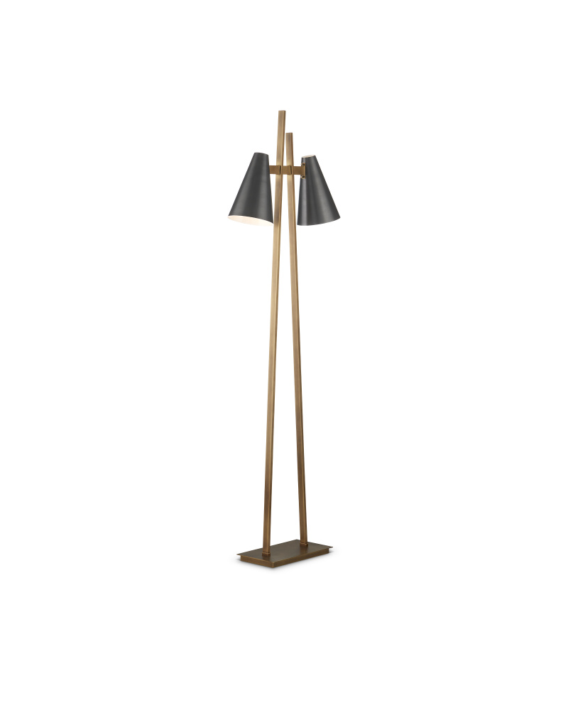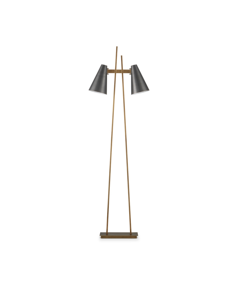 The Duet Floor Lamp has a pair of shades are aimed to give two readers the perfect amount of light when the lamp placed between two chairs. A design detail of note is the asymmetry of the two metal bars that rise up from the base, all in an antique brass finish. The contrasting fixed shades, in an oil-rubbed bronze finish, have white interiors for a brighter glow.