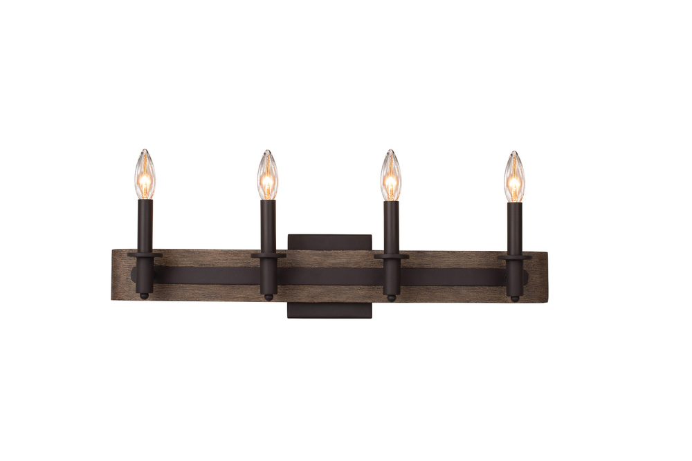 Farmhouse inspired design with wrought iron and hand painted hardwood accents in a Satin Bronze finish.