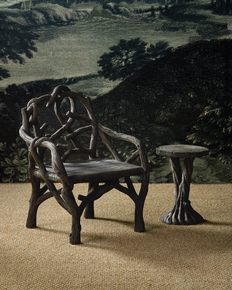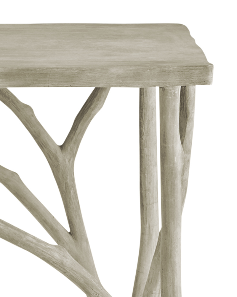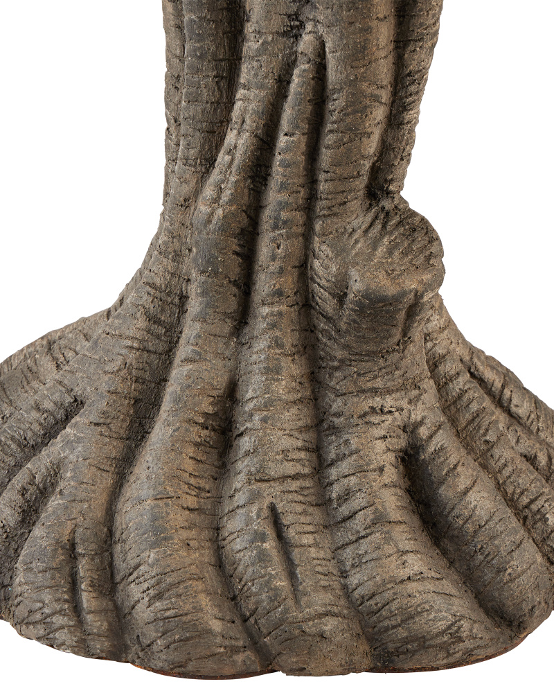 In the Currey & Company fashion of producing exemplary designs in faux bois, the Dunmore Accent Table has a striated texture that makes it feel so convincingly like wood, it lives up to its centuries-old designation. Furthering the natural feel is the Charbon de Bois finish applied to the entire piece, and the top, which is formed to look like it has the life rings of a real tree. The way the root-like formations on the base twist is a graceful element to the design.