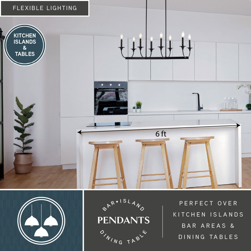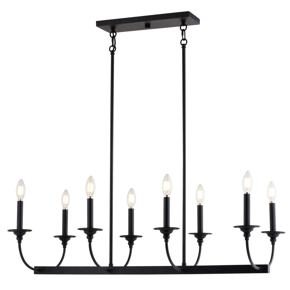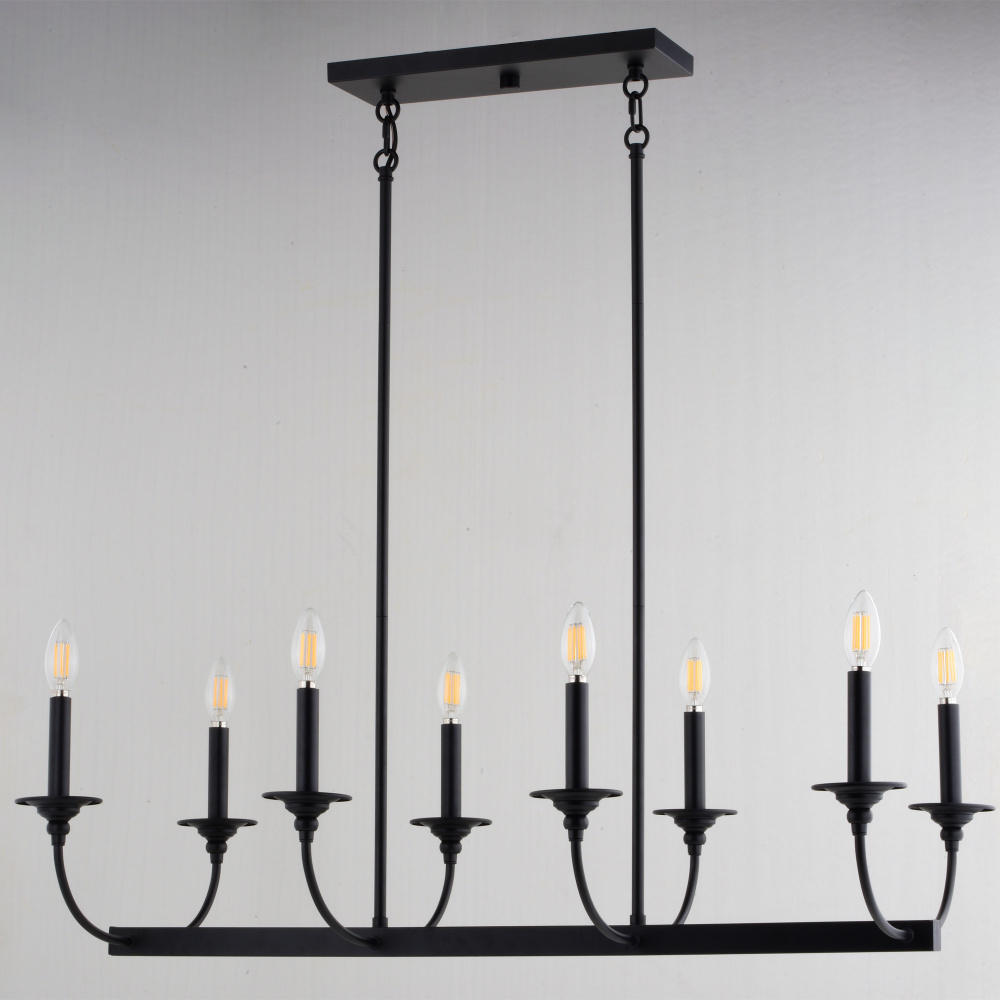 Transform your dining or living space with the Durham 8-light linear chandelier. Its modern matte black finish and open design, featuring exposed bulbs, create a warm and inviting atmosphere. Gracefully arched arms offer a classic silhouette, blending traditional charm with contemporary style. This linear light fixture is perfect for illuminating long dining tables, kitchen islands, or large living areas, providing ample light distribution. The Durham linear chandelier brings refined simplicity and lasting style to your home.