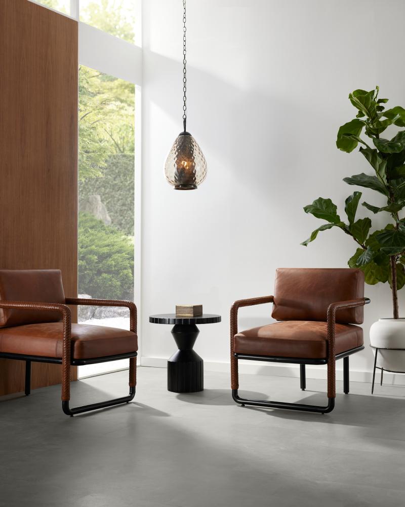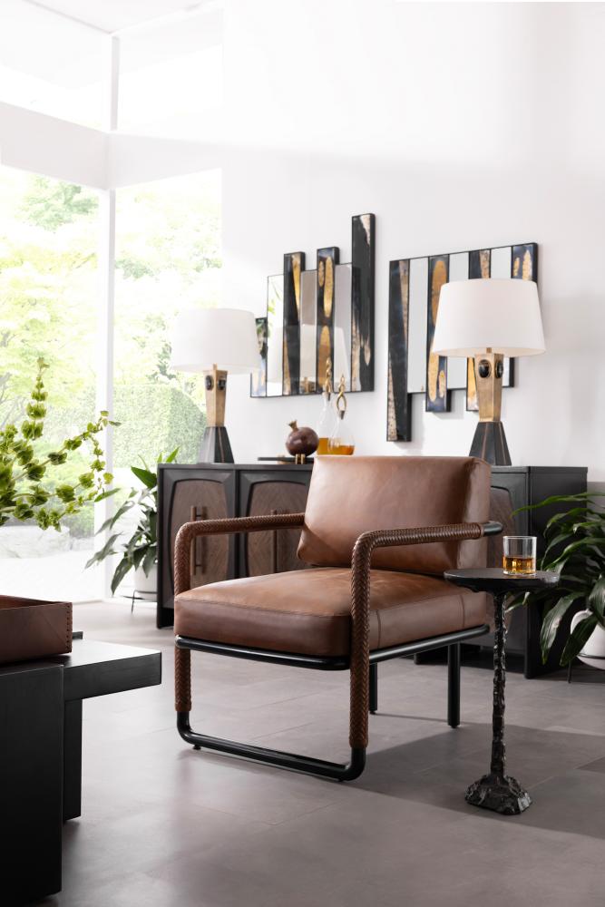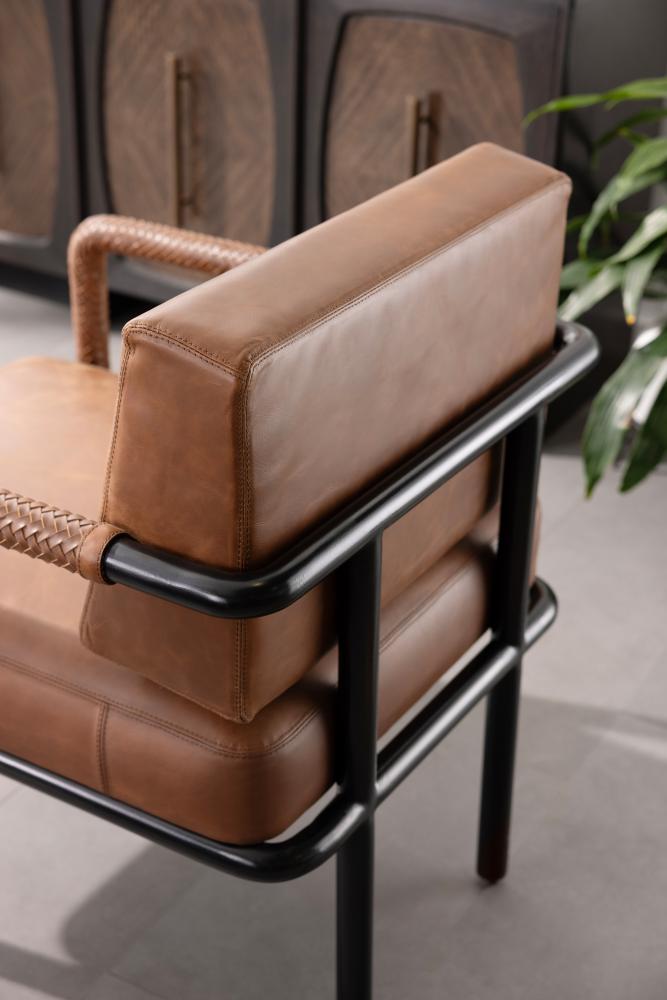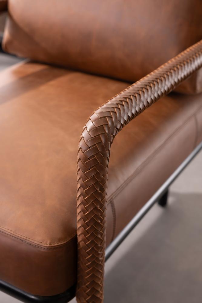 The classic leather club chair, updated with modern open arms and pieced details. Tactile braided leather of a rich cognac hue on each arm complements its sturdy mid-century lines. An open frame of blackened bronze stainless steel makes this generously scaled seat both airy and easy to place. Finish will vary.