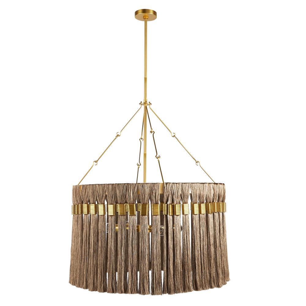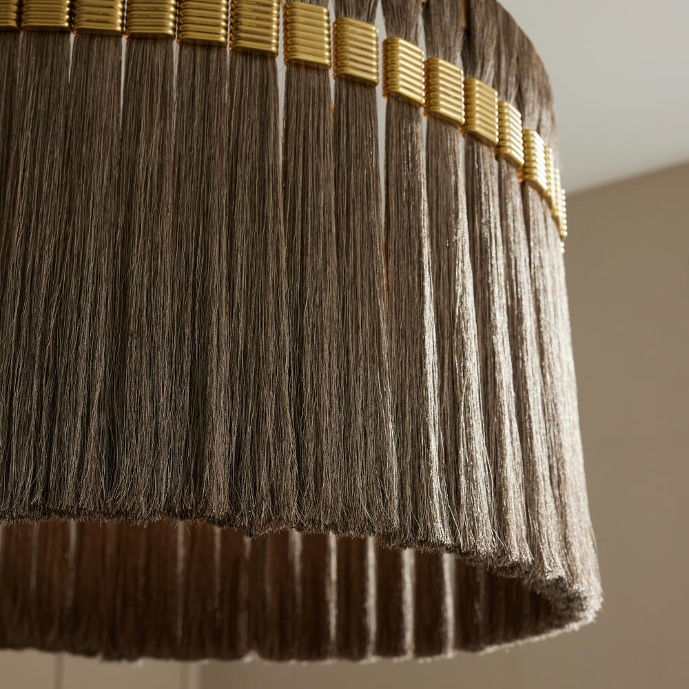 Anchored by matching hook and loop hardware, an elegant drum-shaped light draws its inspiration from the braids and tassels of ancient Greece. A flourish of silken gold and gray fringe is threaded, gathered and bound by shimmering antique brass hardware giving this impactful fixture a timeless appeal. Finish will vary.