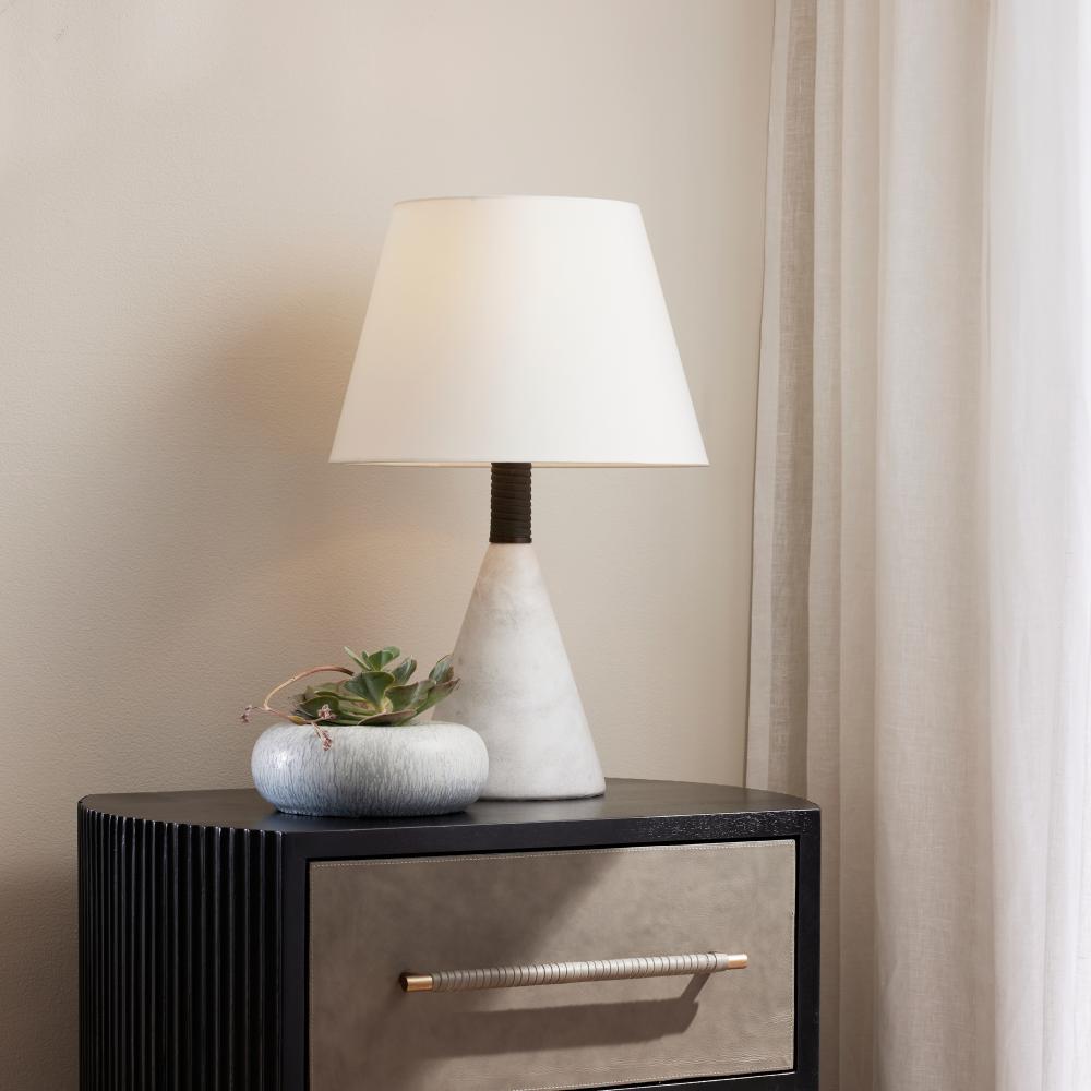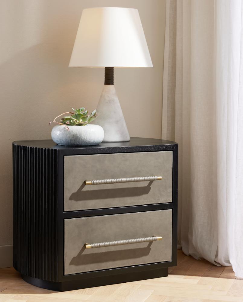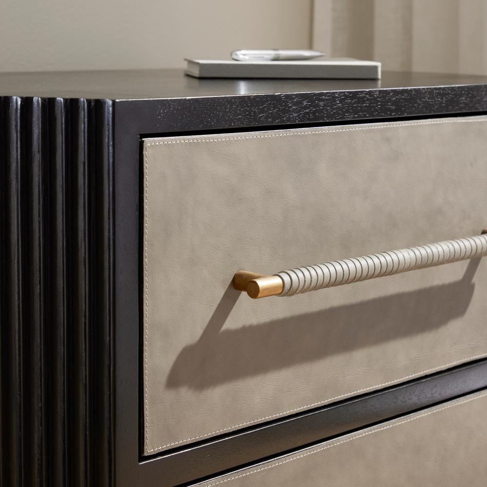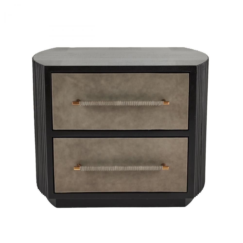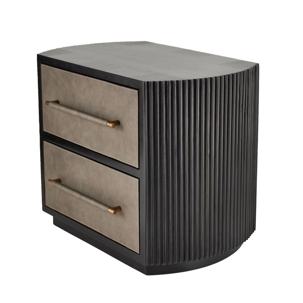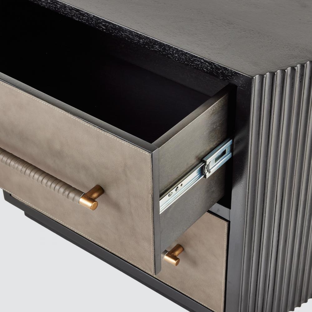 This two-drawer side table of ebony mango wood is a stylish storage solution. Each soft-close drawer is finished with panels of dove leather accented with antique brass hardware for textural interest. Fluted sides add visual appeal from any angle of the room. Finish will vary.