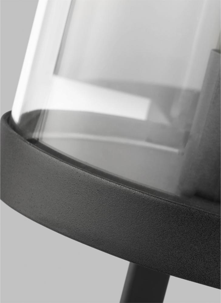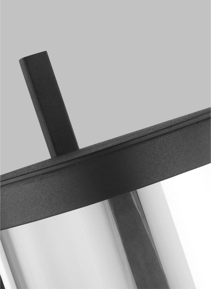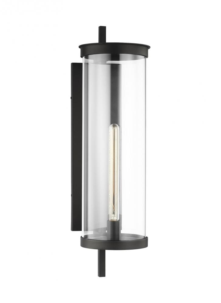 The Eastham one light outdoor wall fixture by Chapman & Myers is designed with an upright square metal crossbar which extends beyond the top and bottom of each light to both support and define each light. The crossbars intersect two stepped top & bottom metal rims and capture the cylindrical glass shade. Each is illuminated by a tubular filament bulb.