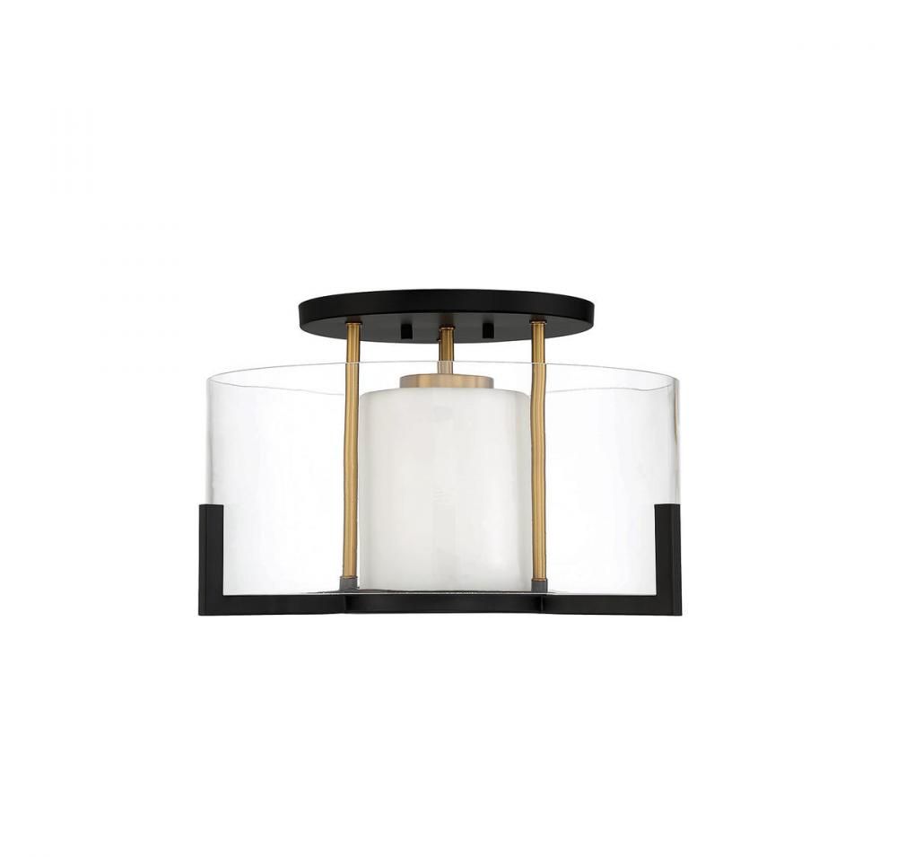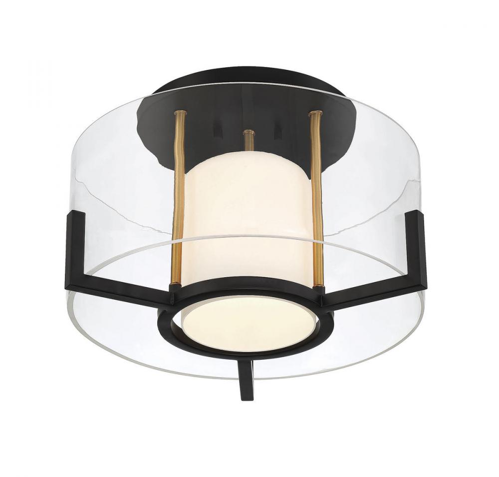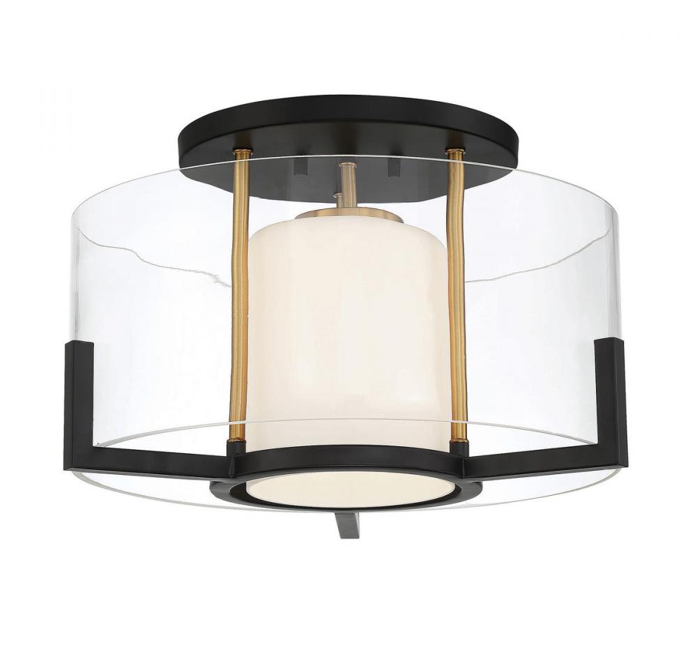 The Savoy House Eaton 1-light ceiling light has an elegant and appealing look with a shade of clear and white opal glass, jewelry-like prong detailing and a two-tone finish of black and brass. Get the beautiful warmth of candlelight without the drama of flames and wax. Eaton is 10.25" in height and 17" in width. Uses one standard size bulb of up to 60 watts.