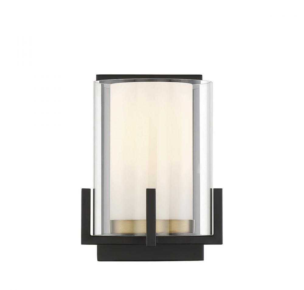 The Savoy House Eaton 1-light sconce has an elegant and appealing look with a shade of clear and white opal glass, jewelry-like prong detailing and a two-tone finish of black and brass. Create the illusion and beauty of candlelight with Eaton! This sconce is 8.25" in height, 6" in width and extends 7" from the wall. Uses one standard size bulb of up to 60 watts. Damp area rated.