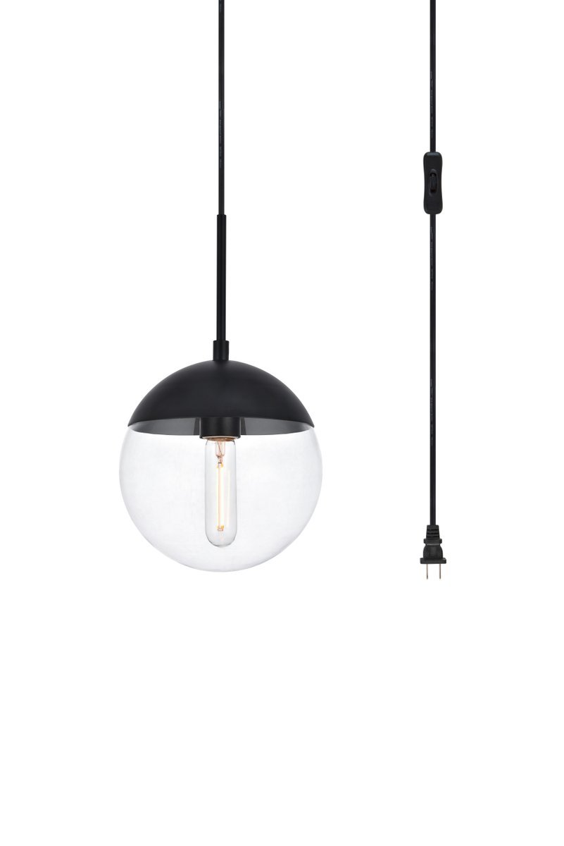 Refined style with a practical design, Eclipse plug in pendant lamps bring cosmopolitan sophistication anywhere, especially to an entryway, office, bathroom, bedroom, or kitchen. The smooth iron round frame comes in a black finish. A 15 foot black cord allows you to vary the hanging height off the swag hooks. Since this is a plug-in you can move it around easily to add light wherever you go. A touch of color on top of the clear spherical glass shade brings character to this classic style. Living in the big city has never been this easy. Simply hang this piece on the provided swag hooks and plug it in for an effortlessly easy installation - can be hung from a sloped or vaulted ceiling.