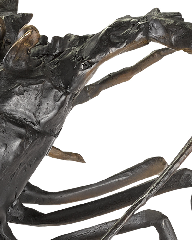 Our Edo Lobster Bronze sculpture is made from a lost-wax technique when boiling bronze is poured into a mold covering an original wax sculpture that melts away. Once set, there is a very long process of refining the bronze to give it patina. This was an incredibly difficult piece to achieve as it so intricate, and we are proud of this piece that will be an antique of the future.