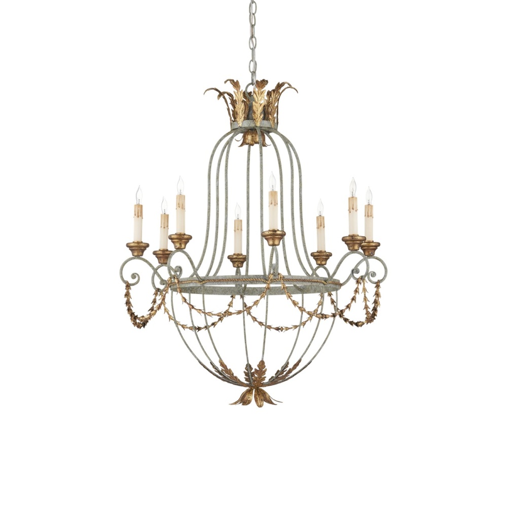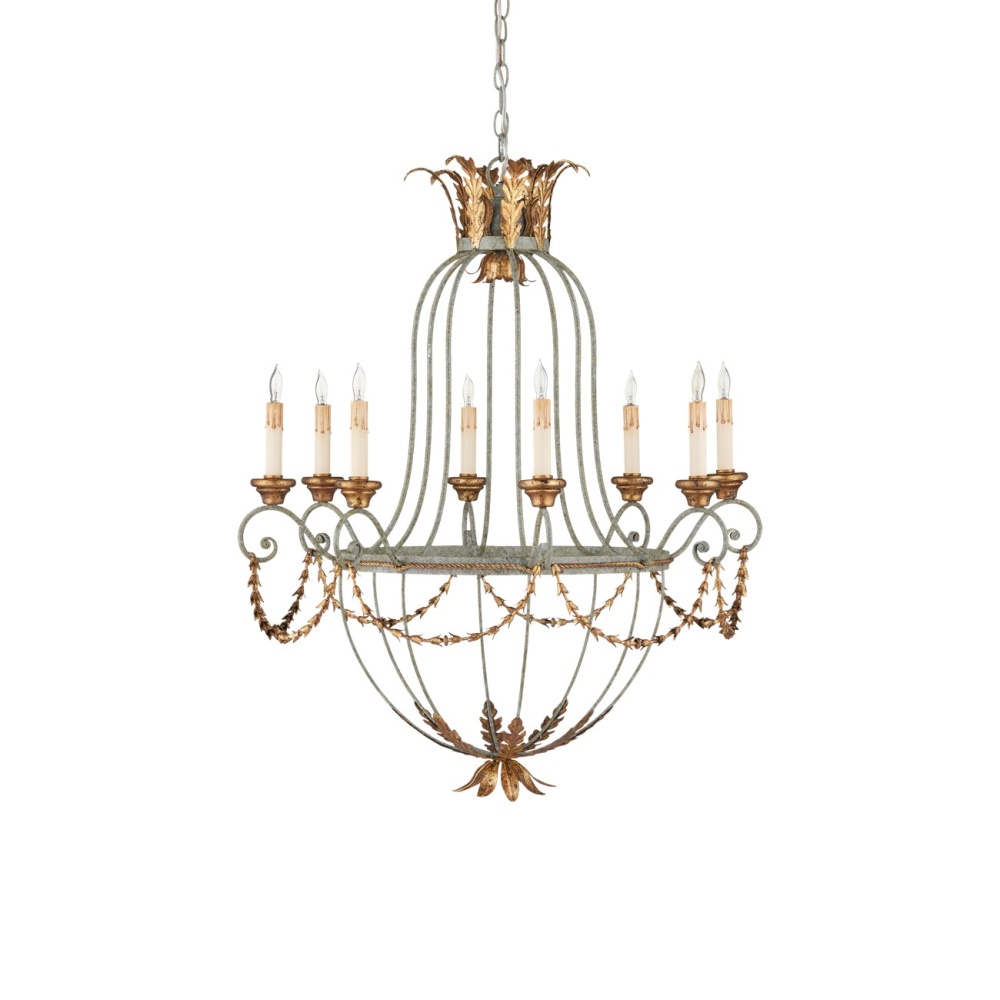 It takes a special design to live up to the name given to this chandelier; fortunately for fans of time-honored aesthetics, the details of this decorative light fixture live up to its moniker. The Elegance Chandelier is embellished with acanthus leaf and rope motifs, the flounces of budlike cords a crowning touch. The fact that some elements are treated to our matte Etruscan finish while others have been given the sheen of gold leaf means this eight-light chandelier carries its Italianate influences with aplomb.