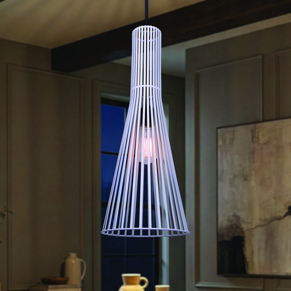The ELIM rod pendant captures modern refinement through contrast and form, pairing a matte black frame with a smooth matte white shade. Its linear cutout design adds quiet depth and dimension, allowing light to filter through softly for a balanced, sculptural effect. At 9 inches wide, this pendant makes an understated statement—equally at home over a kitchen island, dining table, or entryway. The adjustable rod extends from 32.5 to 74.75 inches, ensuring a tailored fit for any ceiling height. Designed for a single 60W Type A bulb, ELIM blends clean geometry with gentle illumination, embodying a contemporary design that feels effortless yet distinctive.