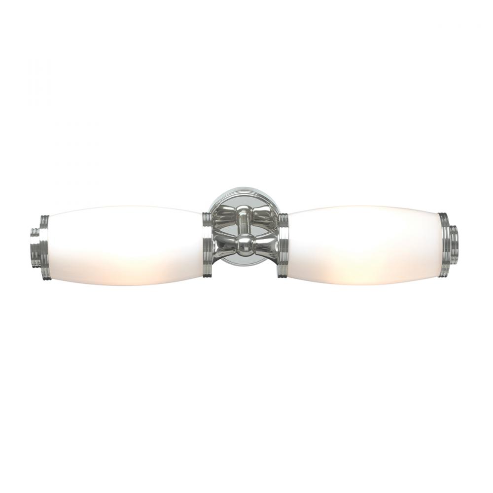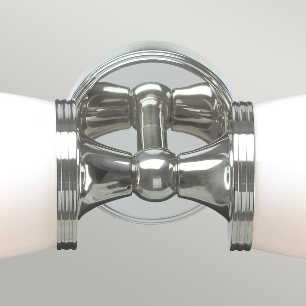 Eliot 2-Light Bath Light: Polished Chrome with bright Opal glass. Up or down mounting offers chic, versatile brilliance for any space.