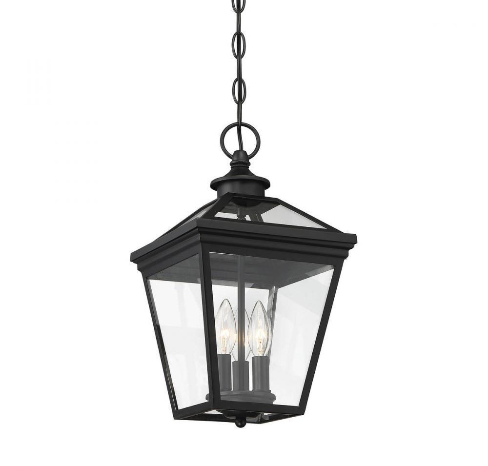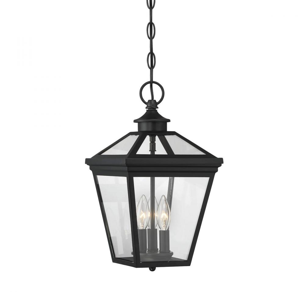 Brighten the exterior of your home and welcome your guests in style with the Savoy House Ellijay 3-light outdoor hanging lantern. The design mimics a vintage gas lantern with a classic tapered box shape and decorative top finial. The black finish looks terrific and blends well with other hardware and architectural materials. Panes of clear glass fill all four side panels and the roof panels, too. Three 40W candelabra size bulbs provide inviting and secure illumination. This lantern measures 9" wide and 15.75" high. You’ll enjoy its timeless style and enhance the beauty of your property, whether on your porch, patio, sunroom, pergola or hung from other outdoor ceilings in your garden and yard.