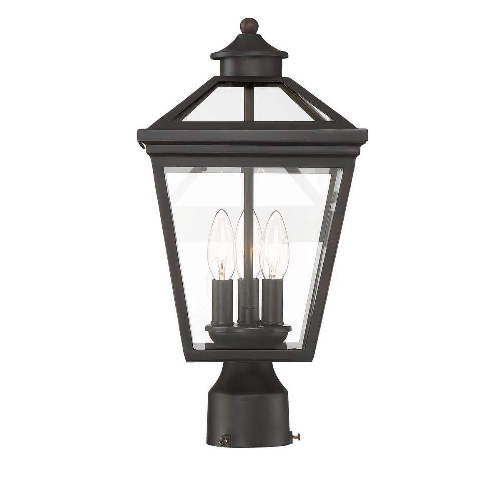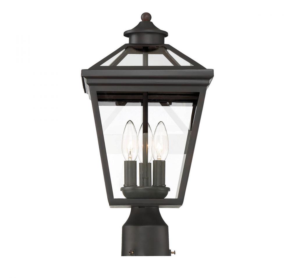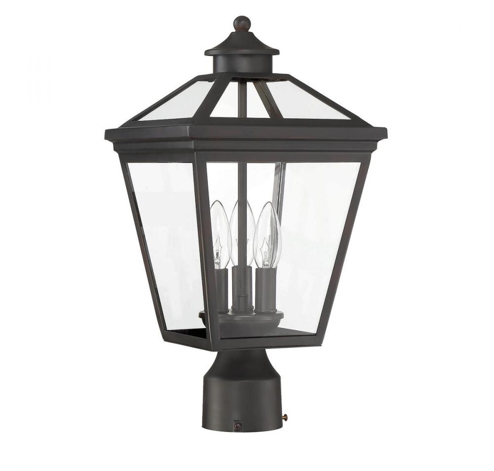 Brighten the exterior of your home and welcome your guests in style with the Savoy House Ellijay 3-light outdoor post lantern. The design mimics a vintage gas lantern with a classic tapered box shape and decorative top finial. A sumptuous English bronze finish adds traditional flair and blends well with other hardware and architectural materials. Panes of clear glass fill all four side panels and the roof panels, too. Three 40W candelabra size bulbs provide inviting and secure illumination. This lantern measures 9" wide and 17.5" high.