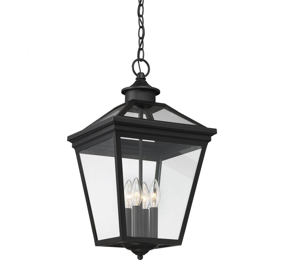 Brighten the exterior of your home and welcome your guests in style with the Savoy House Ellijay 4-light outdoor hanging lantern. The design mimics a vintage gas lantern with a classic tapered box shape and decorative top finial. The black finish looks terrific and blends well with other hardware and architectural materials. Panes of clear glass fill all four side panels and the roof panels, too. Four 40W candelabra size bulbs provide inviting and secure illumination. This lantern measures 12" wide and 20.75" high. You’ll enjoy its timeless style and enhance the beauty of your property, whether on your porch, patio, sunroom, pergola or hung from other outdoor ceilings in your garden and yard.