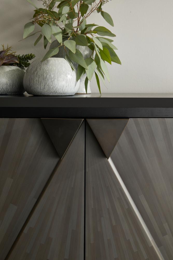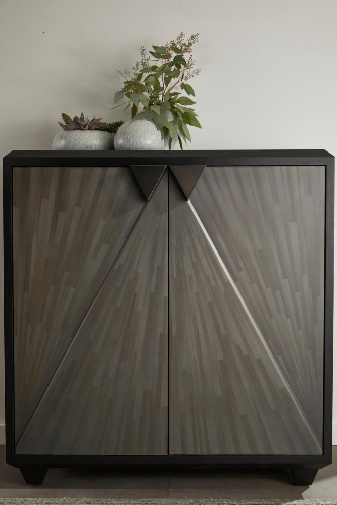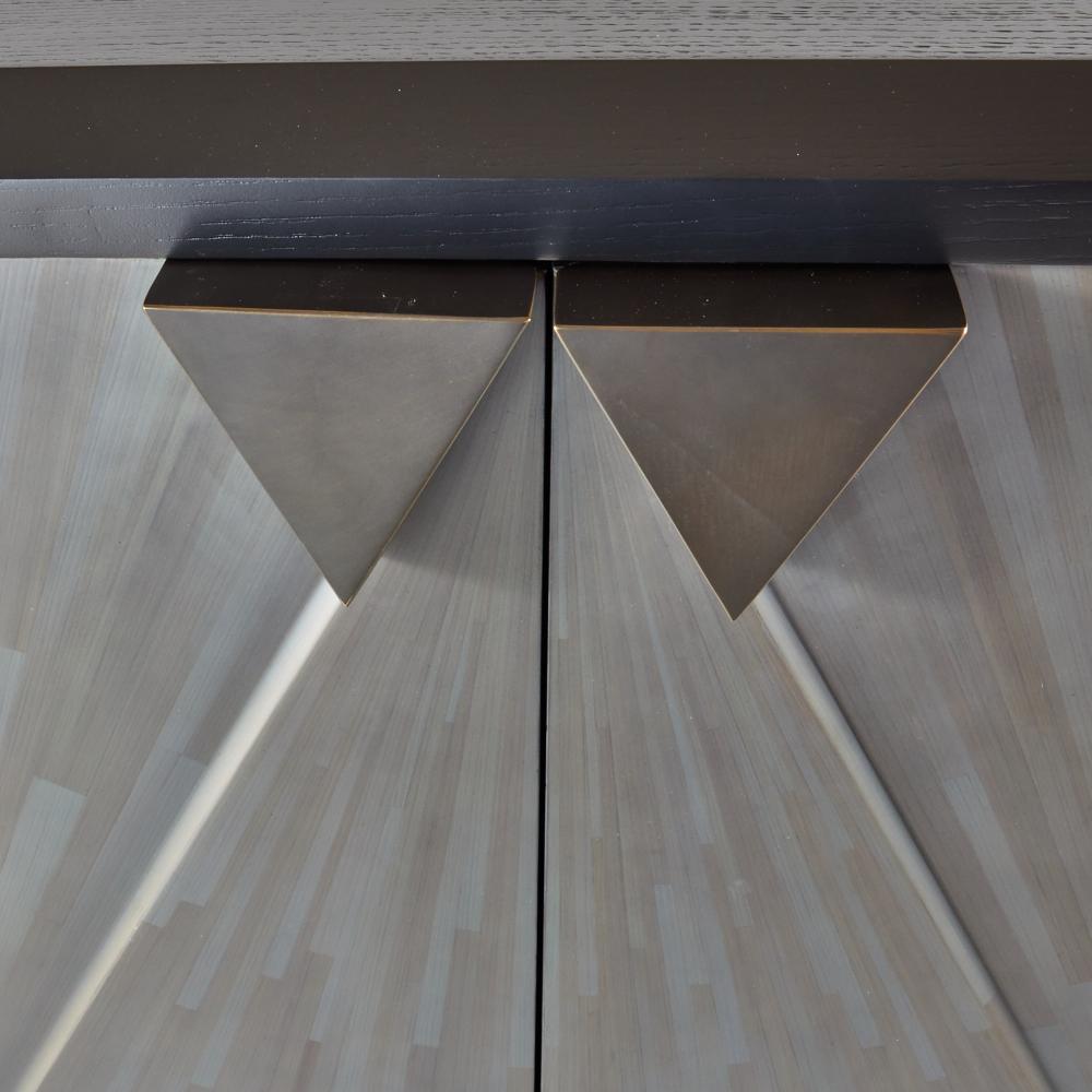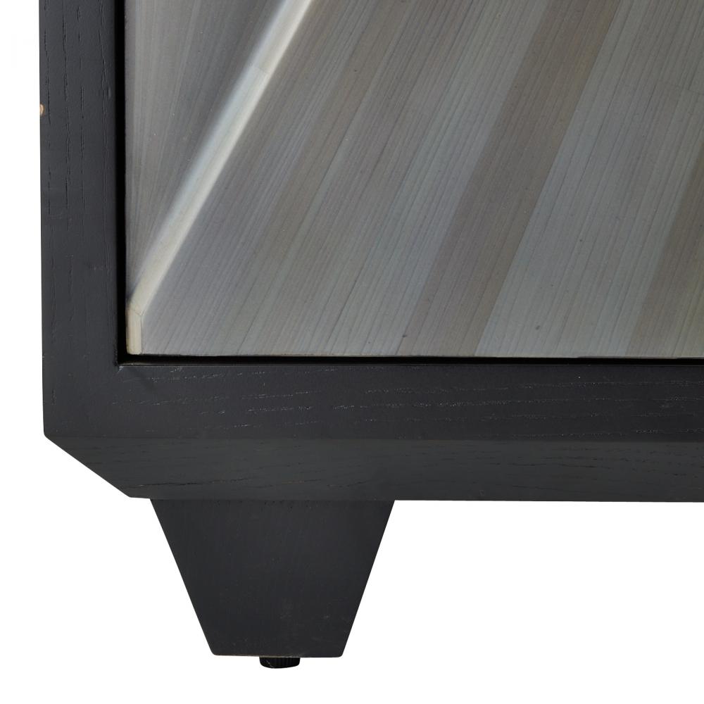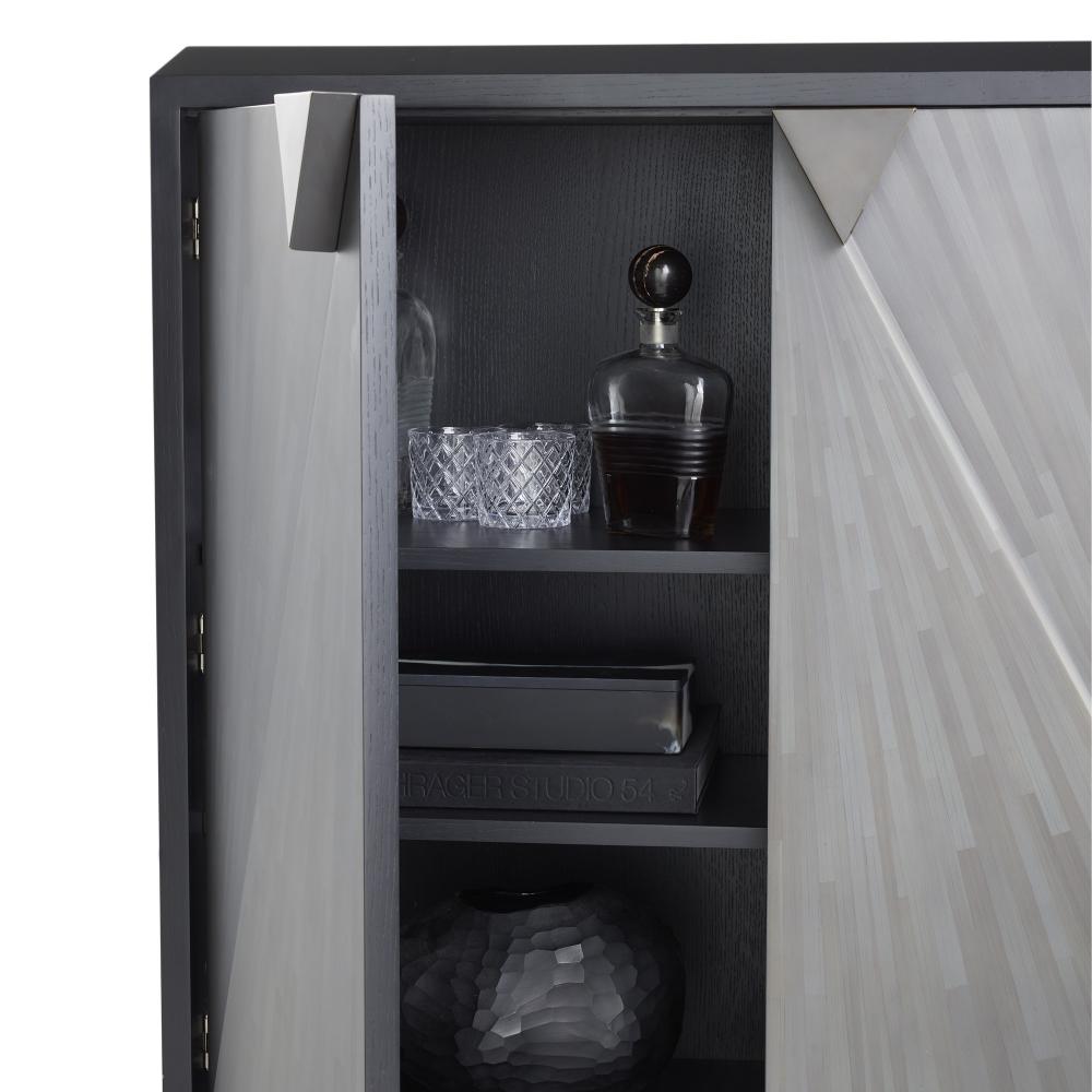 The classic techniques of gray straw marquetry inspired the Ellington. Marquetry made of boiled straw reflects the light, applied in an armor-like faceted patterns. Accented with triangular iron bronze pulls, two doors open to on adjustable hinges to unveil shelving. Framed in ebony oak veneer. Finish will vary.