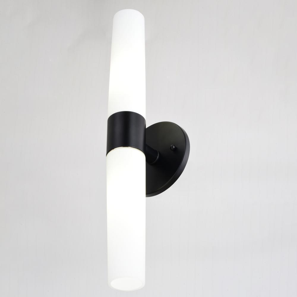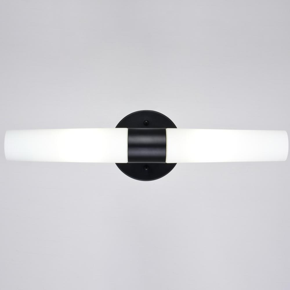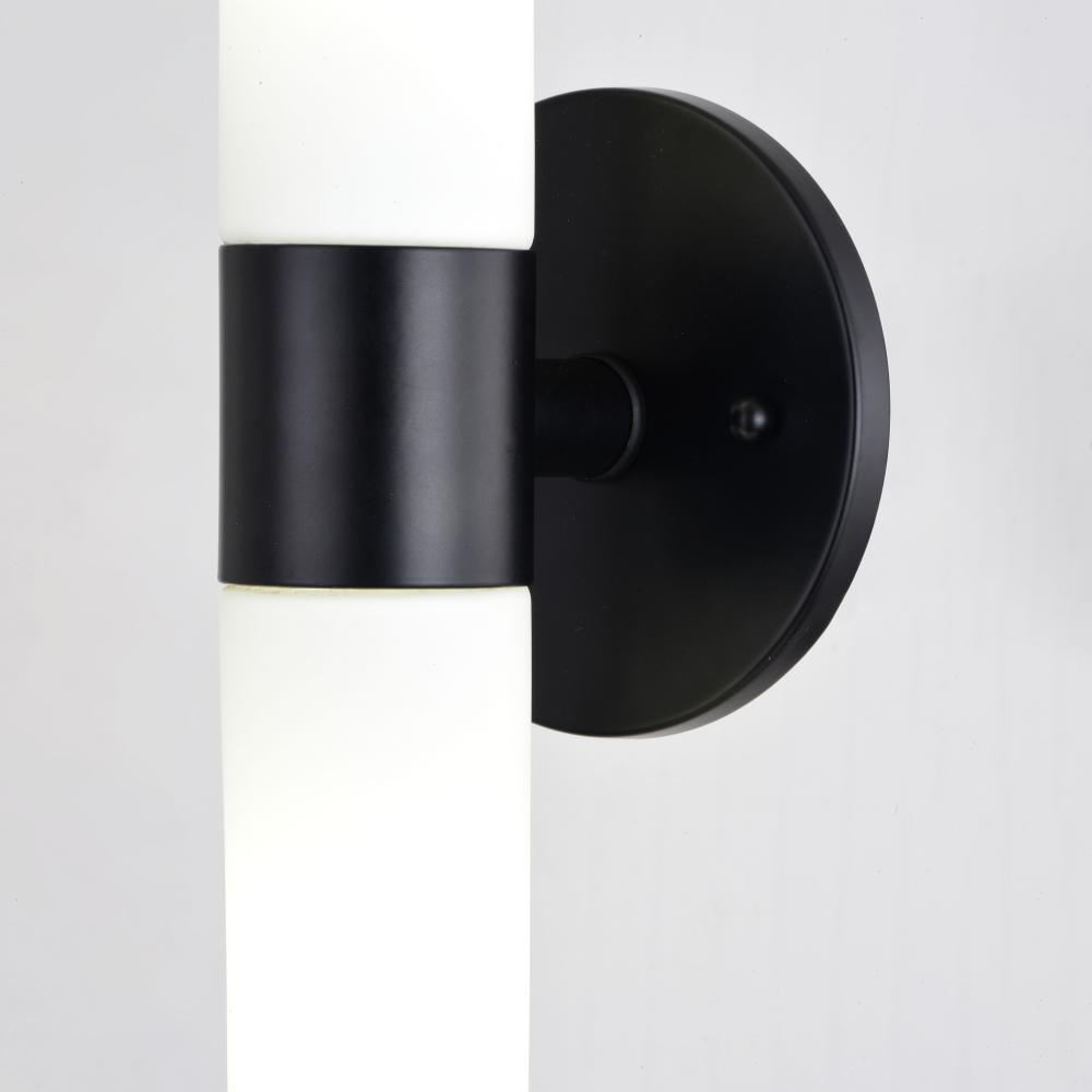 The simplicity and elegance of the Elliot collection is perfectly designed to blend with any contemporary interior at an affordable price. Tapered cylinders of frosted opal glass extend along a circular matte black wall plate, creating a streamlined form. The fixture, with its sleek design and bright illumination, speaks to a sense of functionality as well as style. Mount these versatile fixtures either horizontally or vertically for the ideal look in your bath, hallway or other living areas of your home. Lighting tip: for an even light dispersion, the Elliot will be maximized when paired with two long, tubular bulbs.