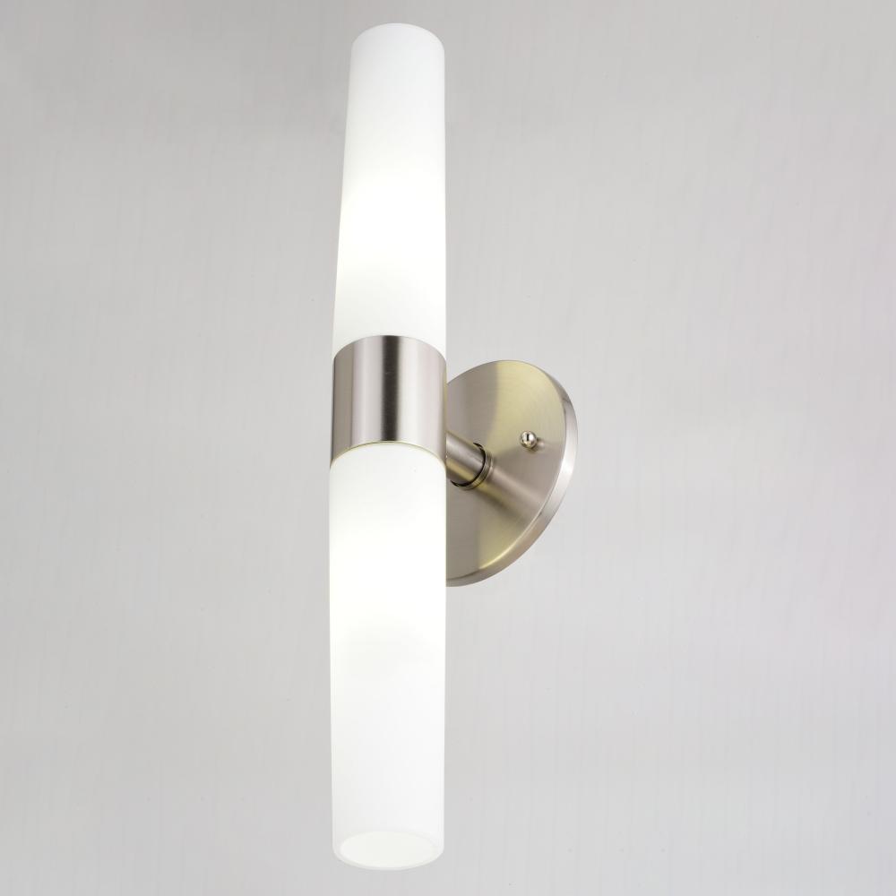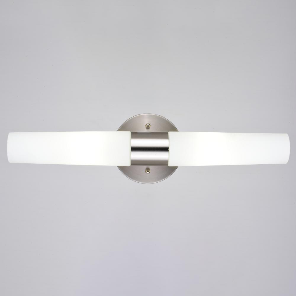 The simplicity and elegance of the Elliot collection is perfectly designed to blend with any contemporary interior at an affordable price. Tapered cylinders of frosted opal glass extend along a circular satin nickel wall plate, creating a streamlined form. The fixture, with its sleek design and bright illumination, speaks to a sense of functionality as well as style. Mount these versatile fixtures either horizontally or vertically for the ideal look in your bath, hallway or other living areas of your home. Lighting tip: for an even light dispersion, the Elliot will be maximized when paired with two long, tubular bulbs.
