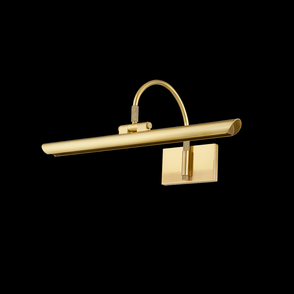 Breathing new life into a classic picture light design, Elowen features a slender silhouette and integrated LED technology. Supported by an arched neck, the shade is folded into a tube, leaving a thin opening that allows a band of light to pass through. Available in two sizes in either an Aged Brass or an Aged Old Bronze finish, Elowen provides discreet, yet powerful illumination of wall decor.