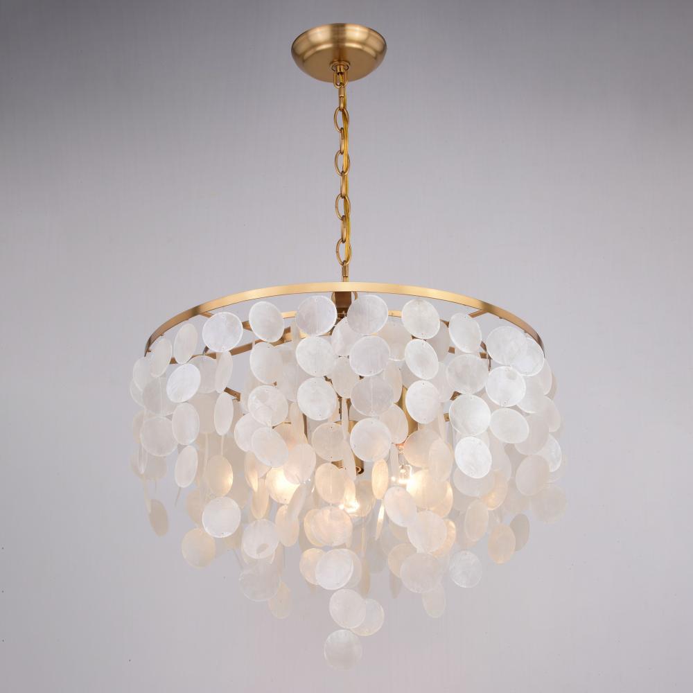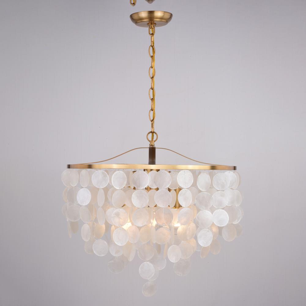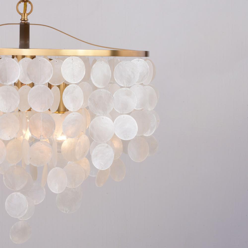 Cascading white capiz shells provide bright illumination and a modern coastal glam style
