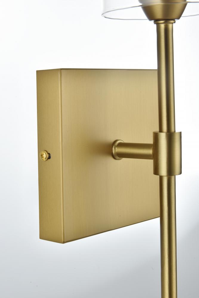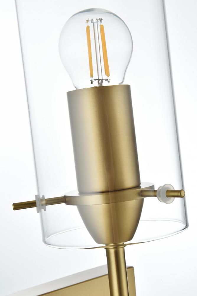 Elevate the ambiance of your space with this stunning wall sconce. Featuring a sleek satin gold finish, this wall sconce blends modern style with classic elegance. The elongated metal arm supports a cylindrical clear glass shade that beautifully showcases the bulb, adding a striking architectural detail. Its minimalist square backplate and torch-like design create a sophisticated silhouette, perfect for any room—from a hallway or living room to a bathroom or bedroom. The satin gold finish adds a reflective quality that enhances its modern appeal while complementing other metallic accents in your decor. This sconce requires one E26 socket bulb (not included) and is compatible with dimmable features, allowing you to set the perfect lighting mood.