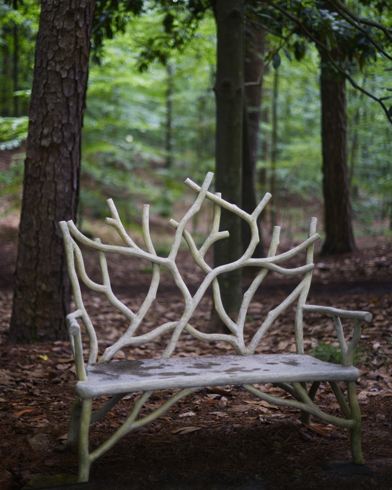 The Elwynn Small Bench appears to be growing up from the ground. The heavy concrete construction of this faux bois bench makes a fantastic addition to a garden or to other outdoor and indoor spaces. Its length can comfortably seat two people. There is also a larger bench in this family of furnishings.