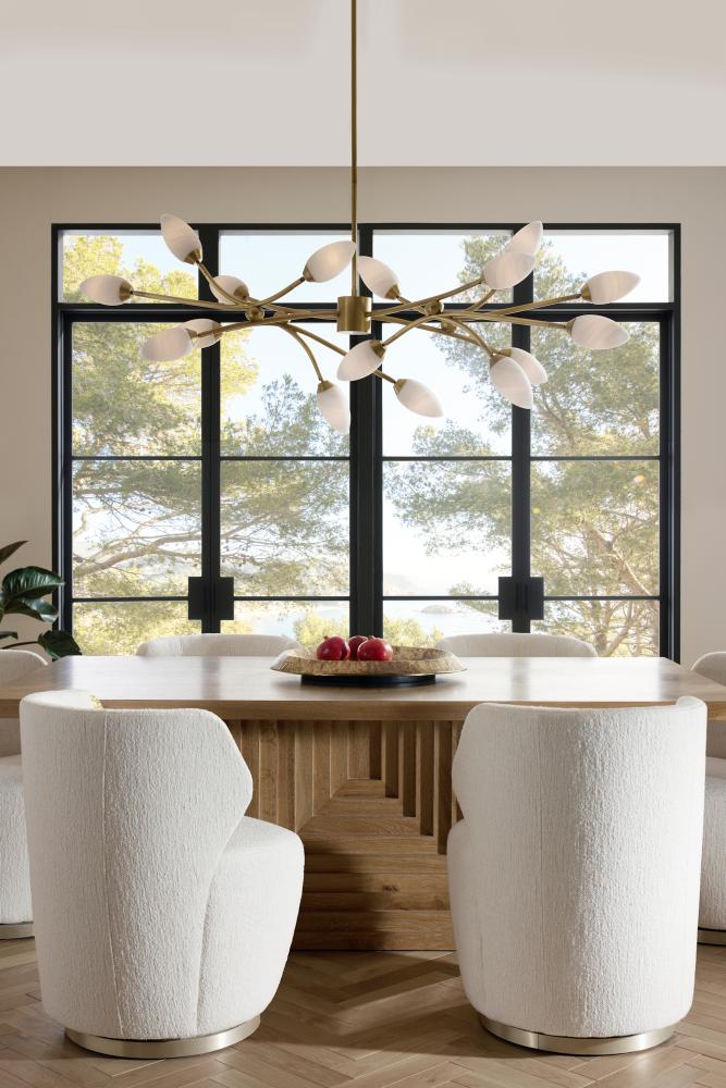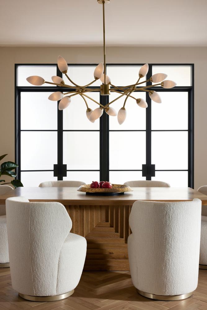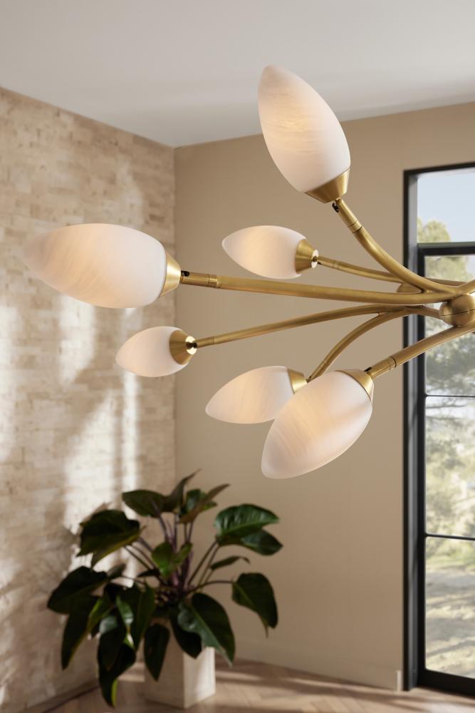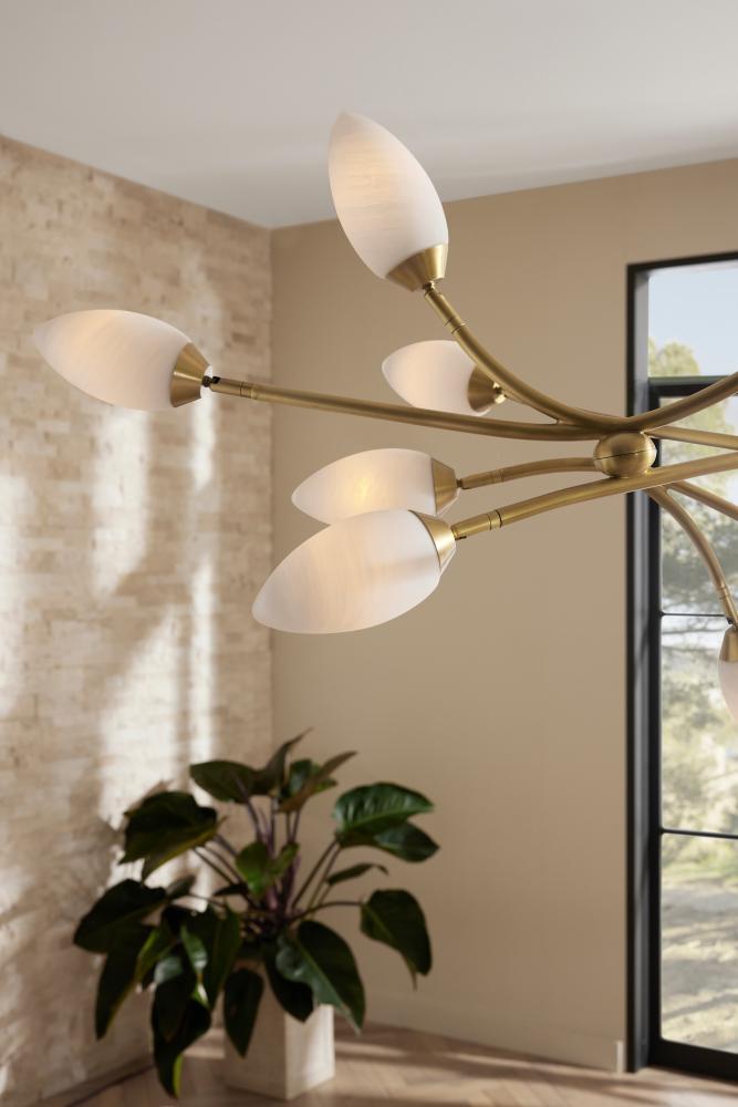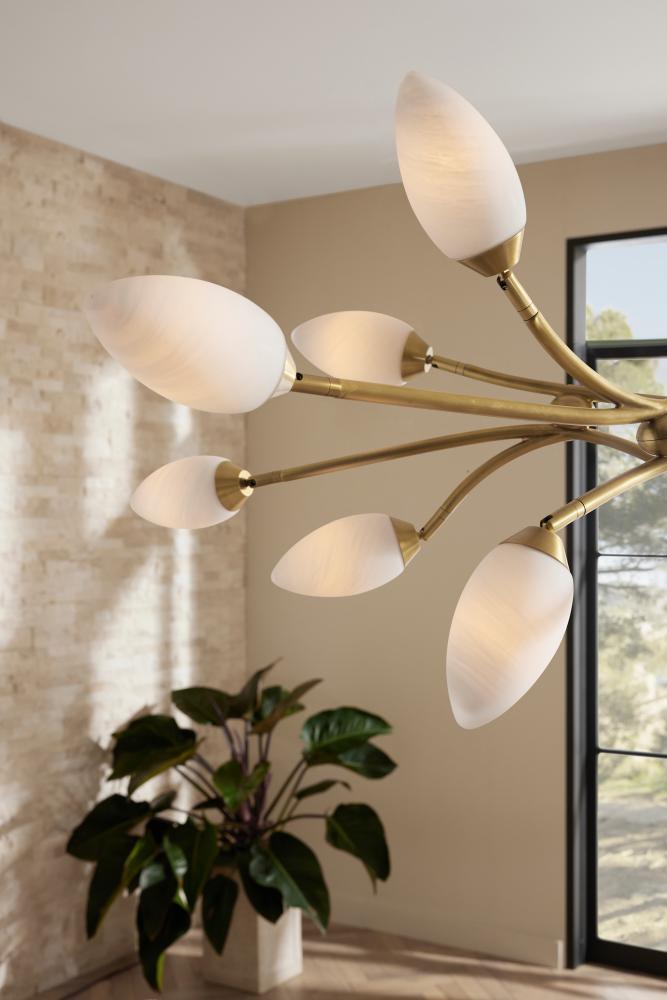 Reminiscent of a botanical stem adorned with flowering blooms and delicate buds, our unique chandelier of antique brass-plated steel offers an intriguing mix of form and function. Each matte swirl glass bulb directs light to a different angle of the room. Finish will vary.