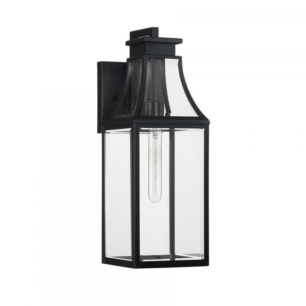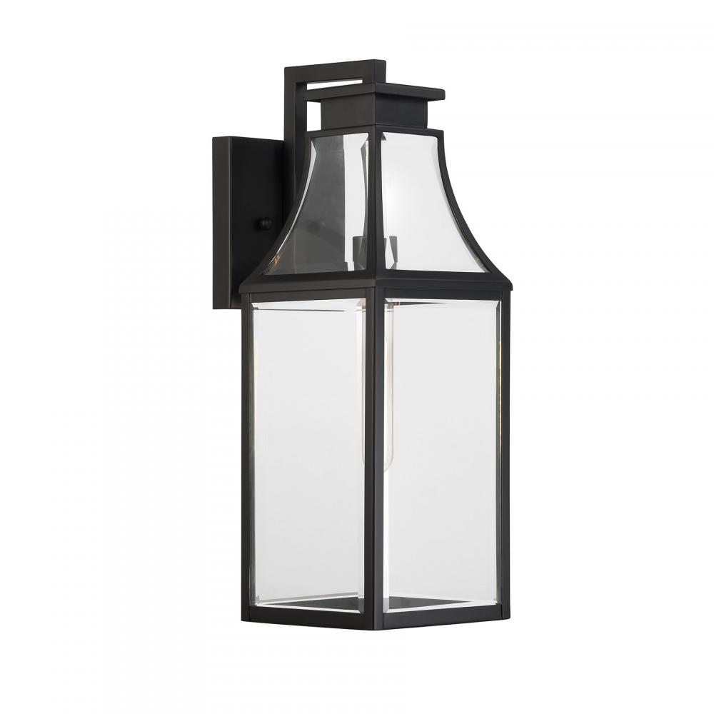 The Savoy House Emery 1-light outdoor wall lantern features a timeless style inspired by charming English cottage homes. Its curving hood and panels are all fitted with clear glass panes that give off a bright glow to light the way. The Matte Black finish is endlessly versatile. Emery is 20" in height, 7" in width and extends 9" from the wall. Uses one standard size bulb of up to 60 watts. Bulb not included. Emery is wet area rated for use in covered or uncovered outdoor areas.