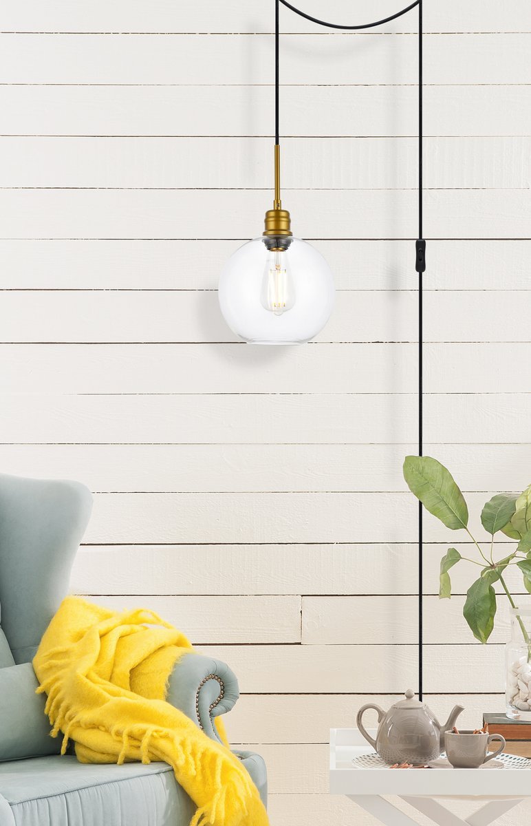 Clean lines and modern whimsy--that's the Emett Collection of plug in pendant lamps. Its Single light makes it perfect for any small apartment or room space, but its also a perfect addition to any larger rooms that requires illumination, such as a dining room or living room. Available in a black or brass finish with a round clear glass shade, it won't be too hard to fit this versatile lighting fixture in your home (light bulbs not included). Comes with a 15 foot cord with an in-line on and off switch. Also includes two swag hooks. Simply hang this piece on the provided swag hooks and plug it in for an effortlessly easy installation - can be hung from a sloped or vaulted ceiling.