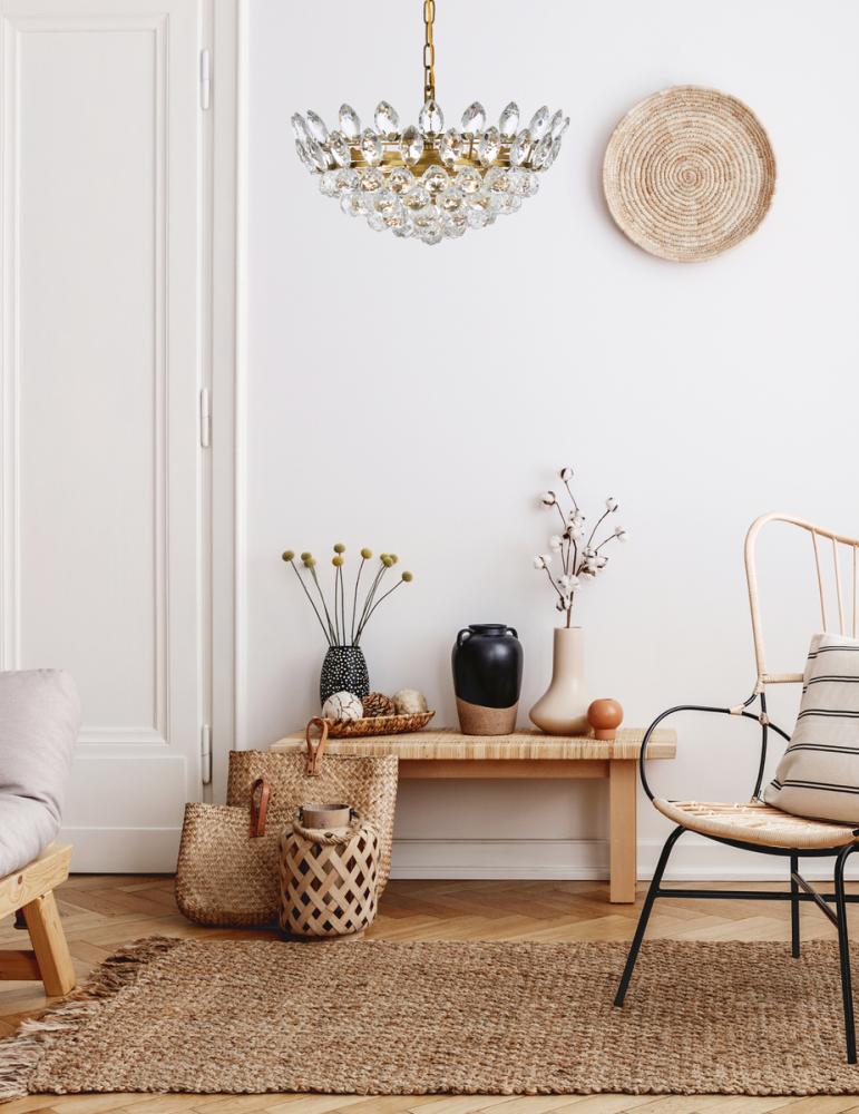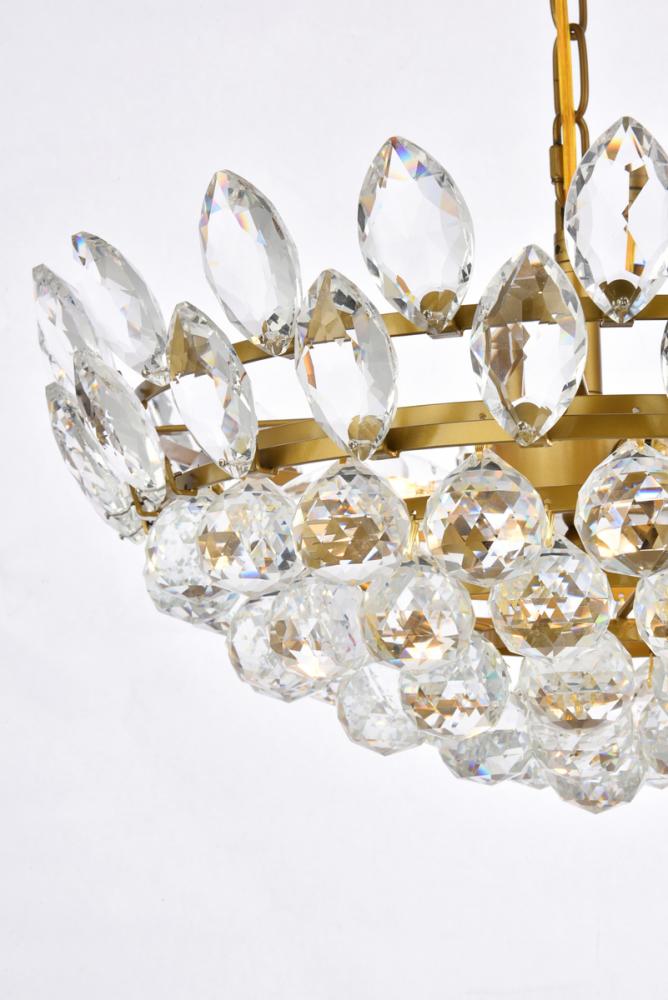 Tiers of clear multi-faceted crystals reflect the soft glow of candelabra bulbs