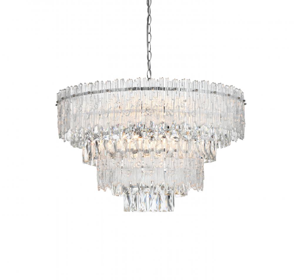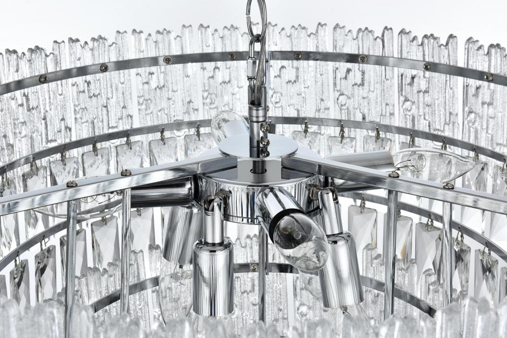 The combination of clear crystals and textured glass creates a sophisticated light play, perfect for setting an elegant mood.