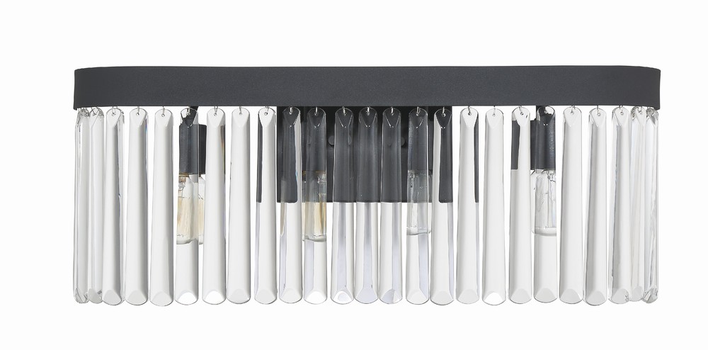 Art deco design is exemplified in this Emory collection bathroom vanity. The collection features a row of smooth glass prisms hanging from a steel frame. Both the Black Forged and Modern Gold finishes, add all the sparkle and glamour you need in a fixture.
