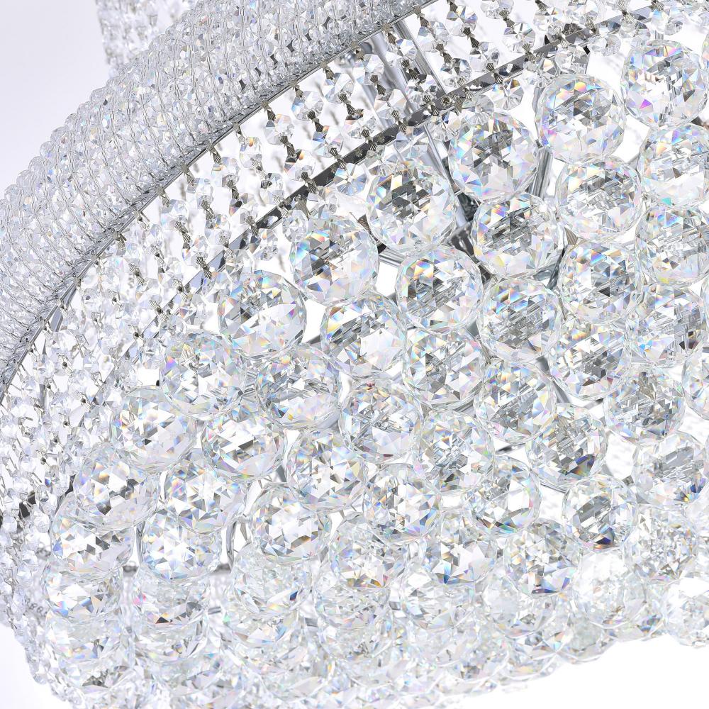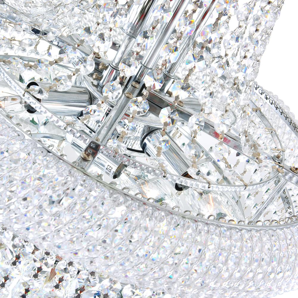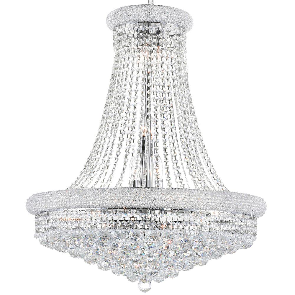 Command attention with the 8001P28C 18-Light Pendant, a breathtaking addition to the Empire Collection. This statement piece features a majestic Empire shape with shimmering chrome plating and layers of dazzling clear crystals that reflect light beautifully. Designed to shine in expansive, upscale spaces, it delivers dramatic visual impact along with ample light coverage. The E12 base ensures compatibility with LED bulbs, allowing you to merge grandeur with energy-conscious living. Make an unforgettable impression with this high-impact pendant built for those who embrace bold elegance.