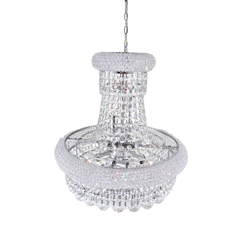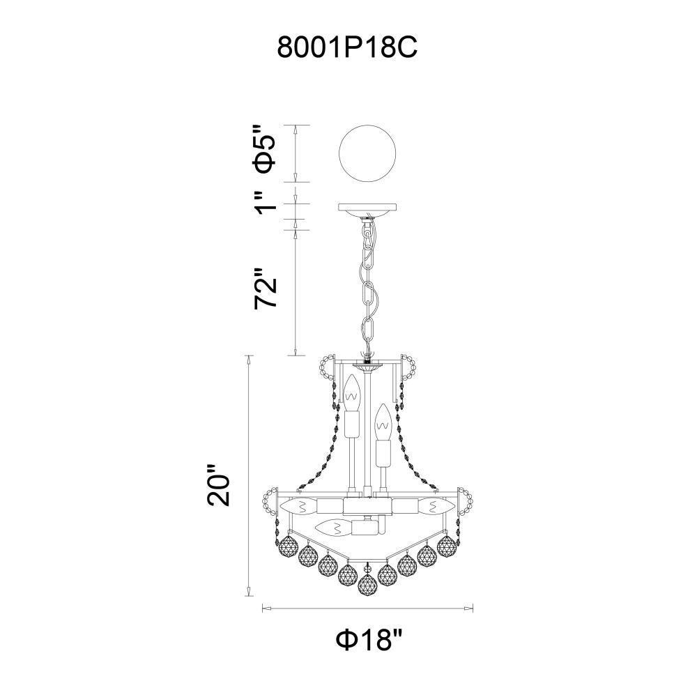 The 8001P18C Pendant Light from our Empire Collection brings timeless grandeur to your living space. Featuring a sleek chrome finish and glimmering clear crystal strands, this fixture draws inspiration from the stately elegance of Empire-style chandeliers. With a diameter of 18 inches and eight lights housed in E12 candelabra sockets (bulbs not included), it casts a brilliant yet refined glow that transforms dining rooms, staircases, or double-height foyers. Compatible with LED bulbs and BACL Certified, this piece delivers lasting style, safe performance, and effortless luxury.