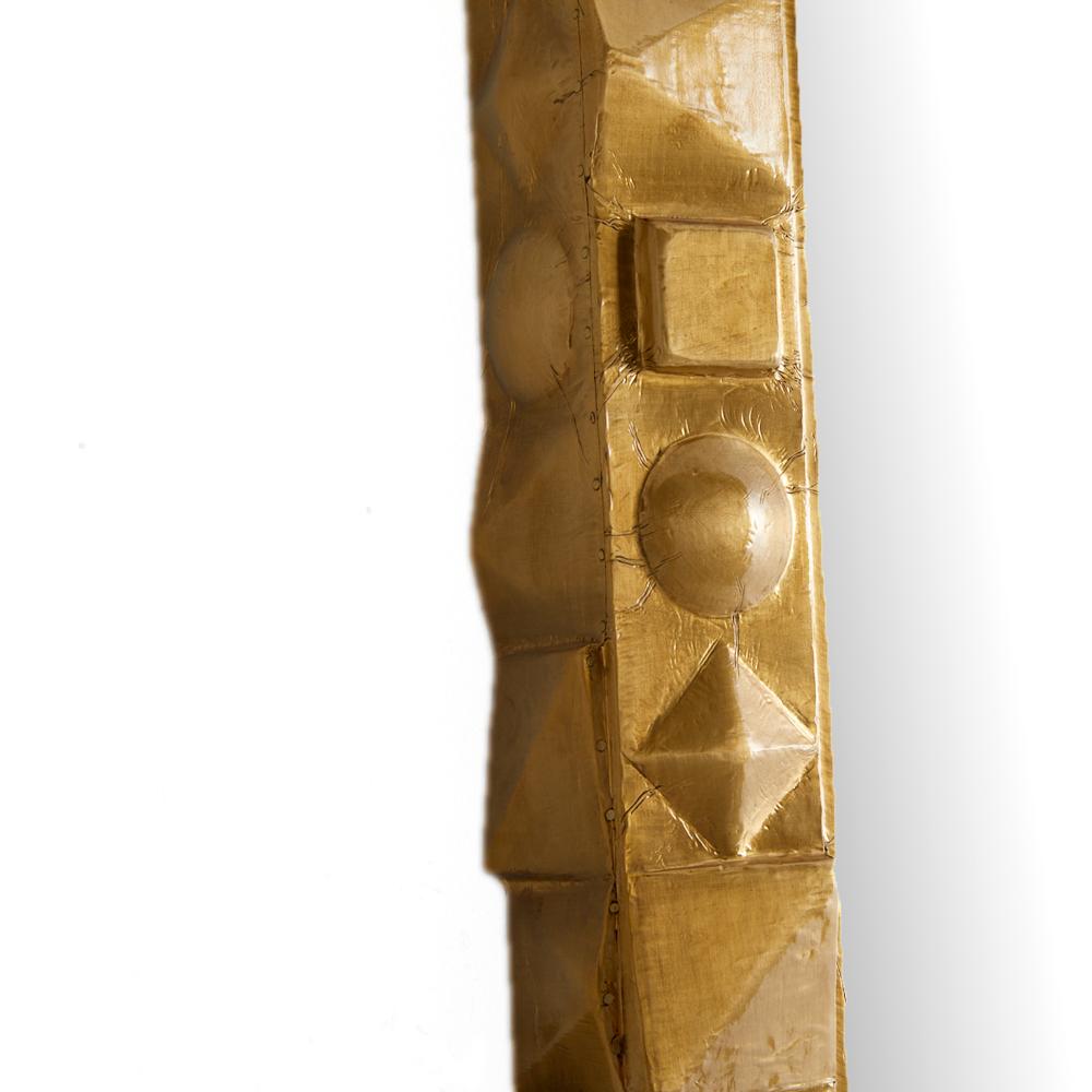 As part of The Empire series of objects: this antique brass mirror created of cast aluminum uses the ideas of origami and geometry as a kind of mystical decorative language conjuring up both treasures of the past and the future. These are the jewelry of the collection, a precise and polished counterbalance to the more hand-hewn objects.