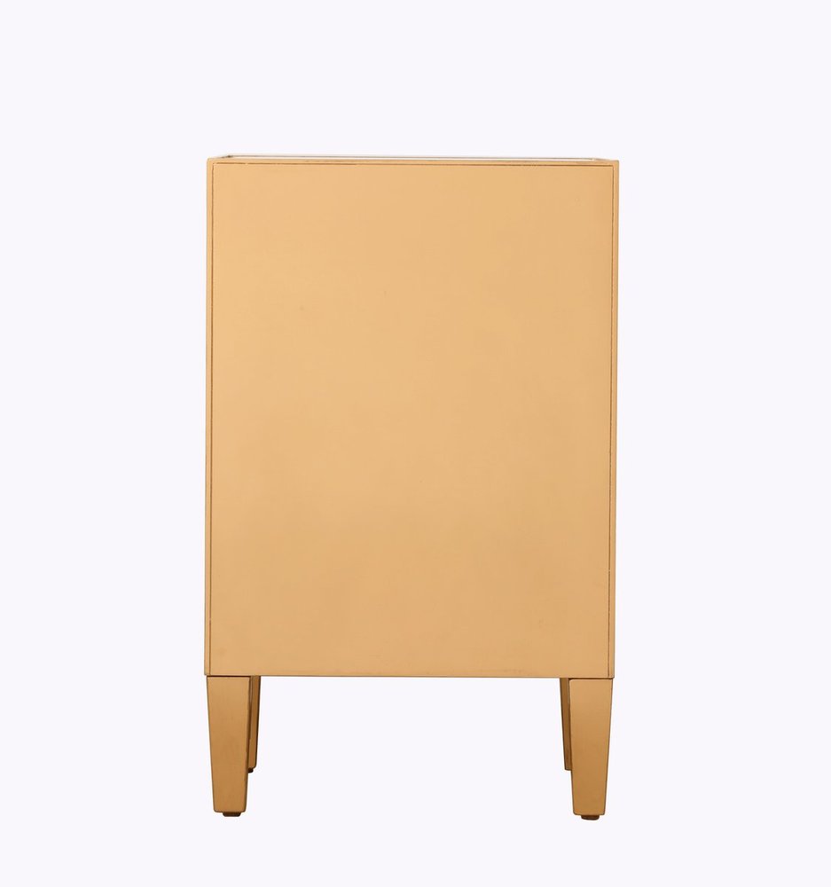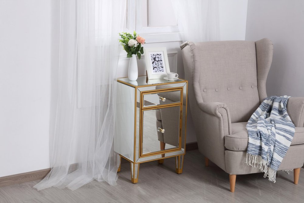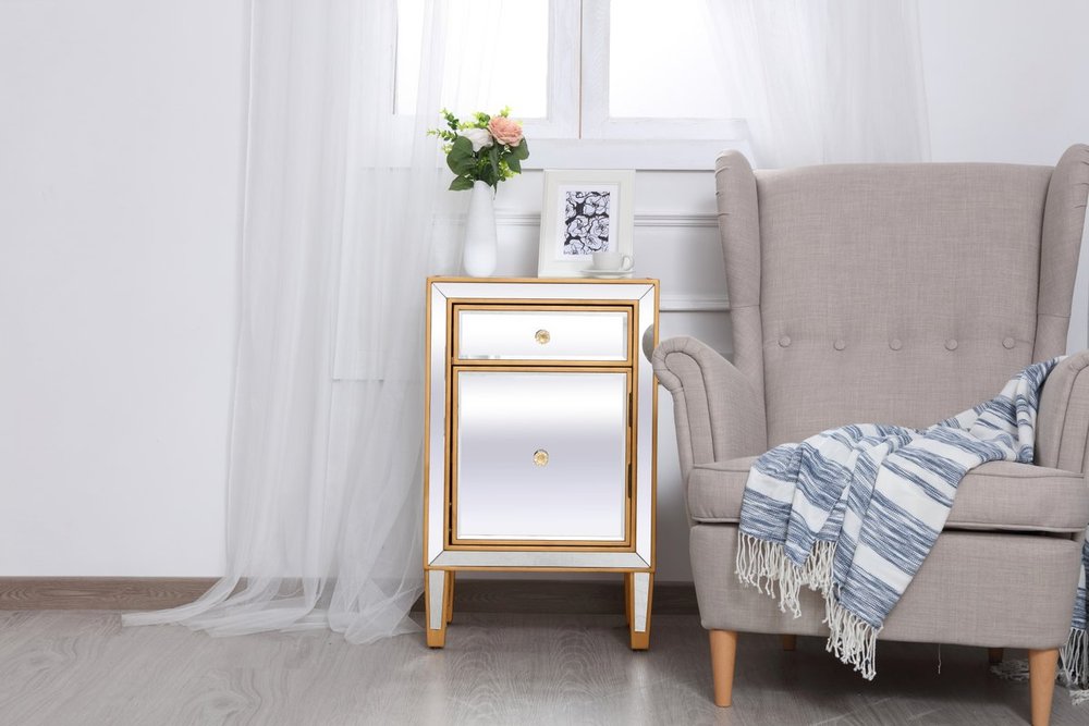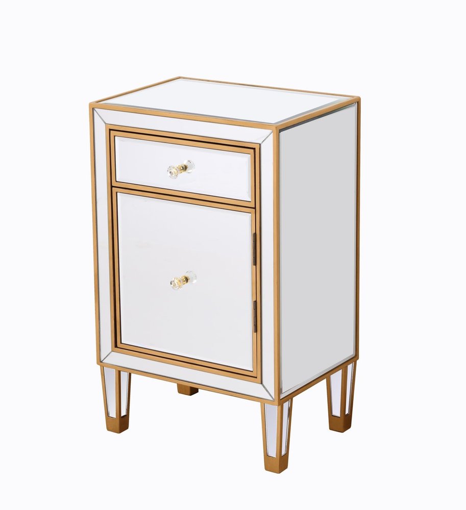 Add a touch of class to your bedroom or any room with this stunning accent chest. With beaming mirrored surfaces, it opens up the visual space in the room while imbuing it with glamour. This functional contemporary chest comes with one drawer, one door, sparkling crystal knob, and gracefully tapered legs. FEATURES: *Reflexion collection *1 drawer and 1 door *crystal knobs *Hand painted gold finish *Beveled mirror panel *Solid wood trim and legs *Wood drawer glides *Inside lining painted in gold. PRODUCT DETAILS: Measurement W18xD13xH29” *No assembly required *Material in solid wood and engineered wood *1 year limited warranty.