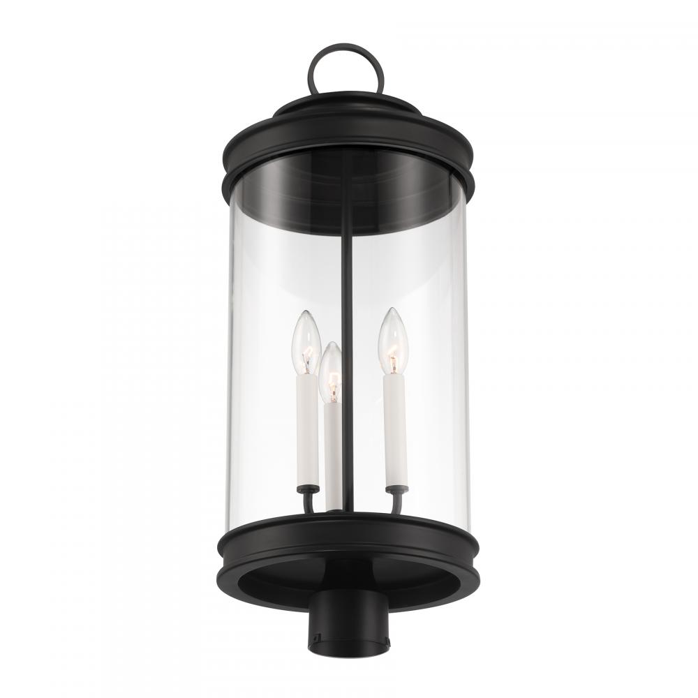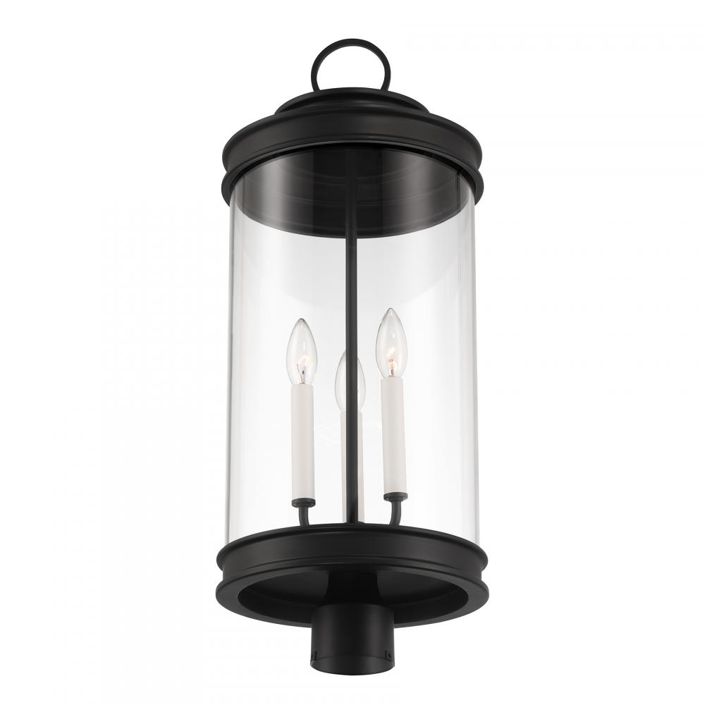 Classic lantern style gets a fresh new look in the Savoy House Englewood 3-light outdoor post light. A beautiful cylinder of clear glass is held in a minimally detailed frame finished in timeless Matte Black. White candle covers create a perfect pairing with the finish. Englewood is 26" in height and 10.5" in width. Uses three candelabra size bulbs of up to 60 watts per bulb. Bulbs not included. Wet area rated.