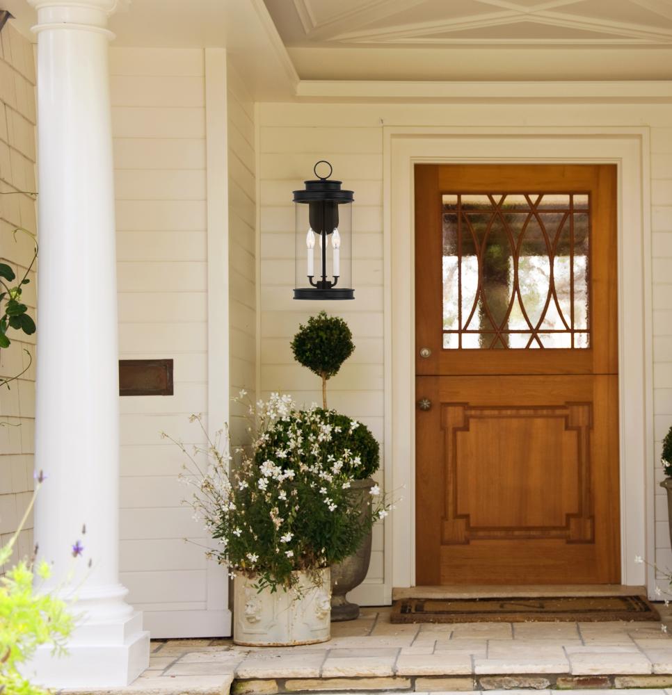 Classic lantern style gets a fresh new look in the Savoy House Englewood 3-light outdoor wall light. A beautiful cylinder of clear glass is held in a minimally detailed frame finished in timeless Matte Black. White candle covers create a perfect pairing with the finish. Englewood is 19" in height, 8.5" in width and extends 11" from the wall. Uses three candelabra size bulbs of up to 40 watts per bulb. Bulbs not included. Wet area rated.