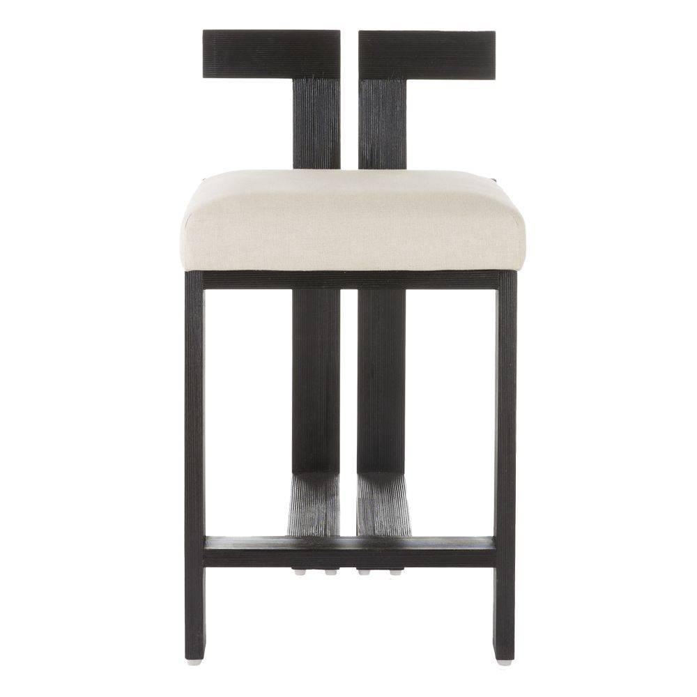 A modern mix of ’70s American design with Zen architecture, this elegant stool has an Eastern appeal. Crafted of ribbed beech wood stained in ebony, the split back is accented with antique brass studs at very center. A padded seat of natural linen adds style and comfort.