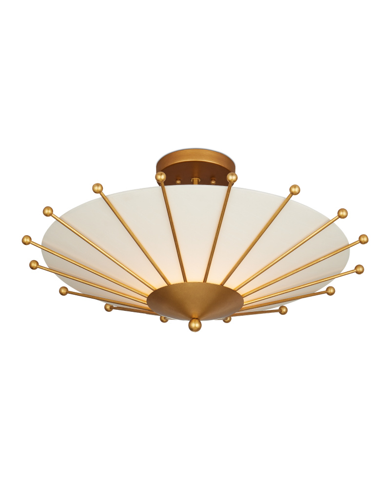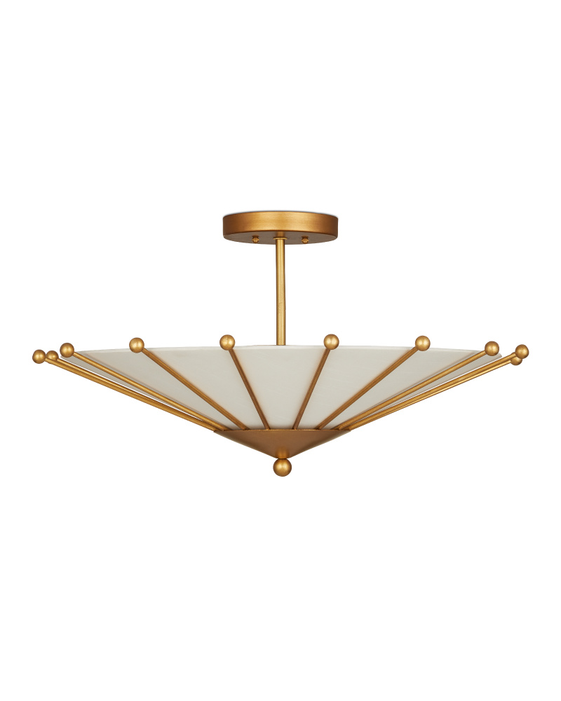 The Epoch Semi-Flush Mount features mid-century modern design elements, with a frame made of wrought iron in a contemporary gold leaf finish. The geometric elements on the frame elegantly clasp the fabric shade, creating a sophisticated look. The shade sits inside the bottom cone on the beige and gold semi-flush mount, and the ribs of metal that hold the shade in place culminate with ball shapes just beyond the fabric's edge.