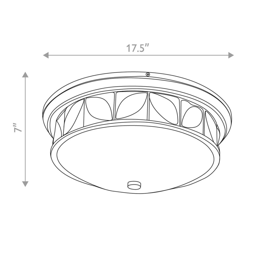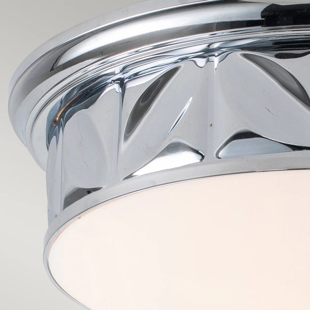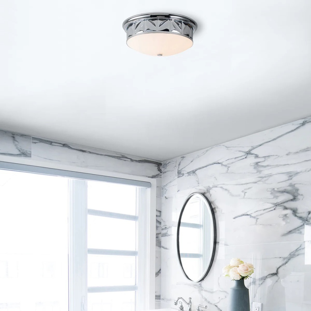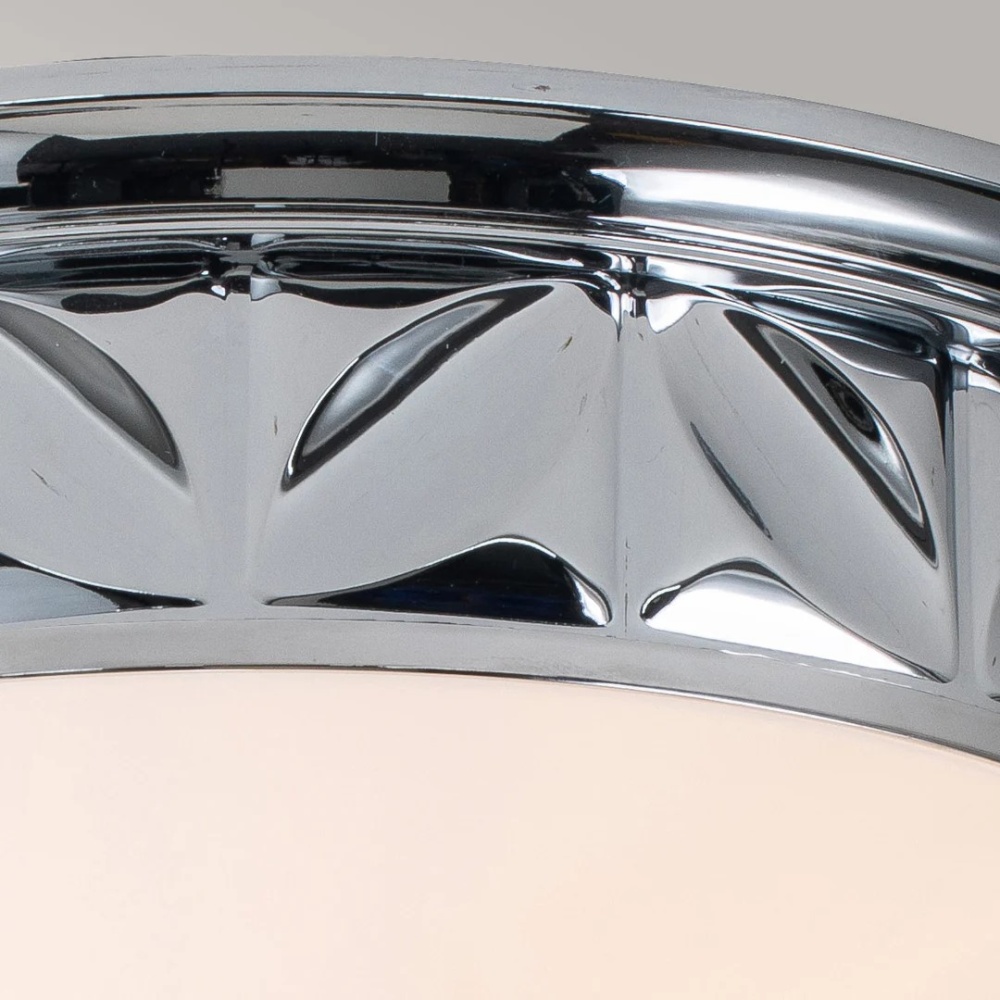 Illuminate in style with this 17.5" round polished chrome flush mount. Refined shape captivates. Damp-rated, with creamy white glass for an inviting ambiance.