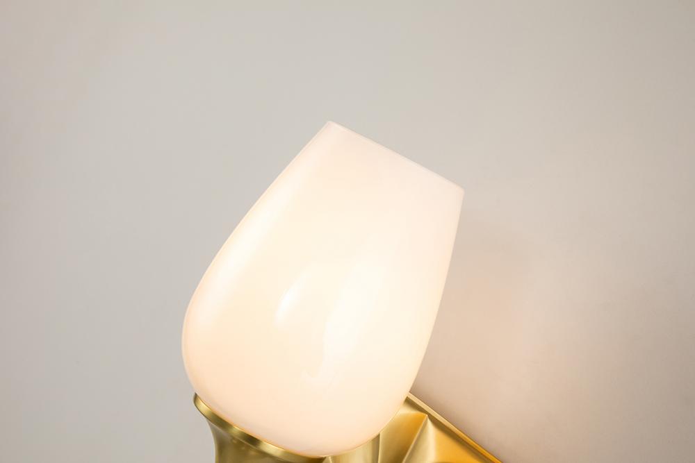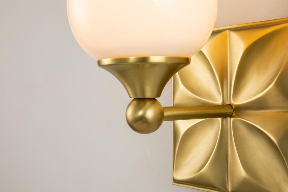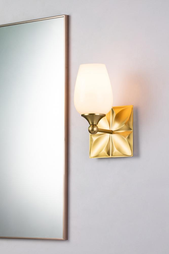 A 6" textured square backplate sconce in aged brass with a wine glass-shaped opal shade. Mounts up or down, adding modern texture and elegance to any room with a focus on design detail.