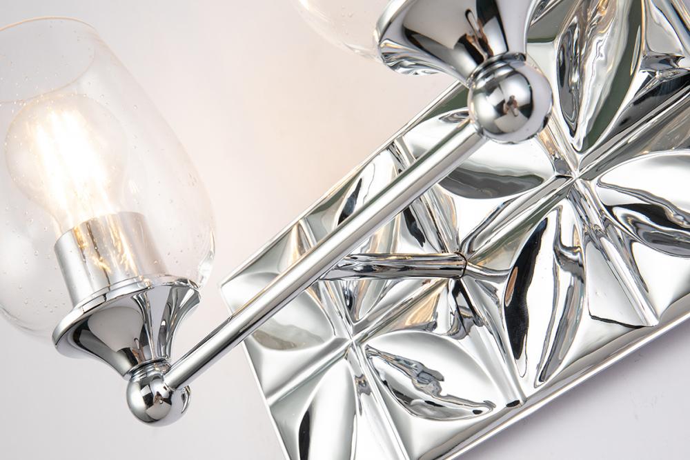 A 14" textured backplate vanity light in polished chrome with two wine glass-shaped seeded glass shades. Mounts up or down, adding modern texture and elegance to bathrooms.