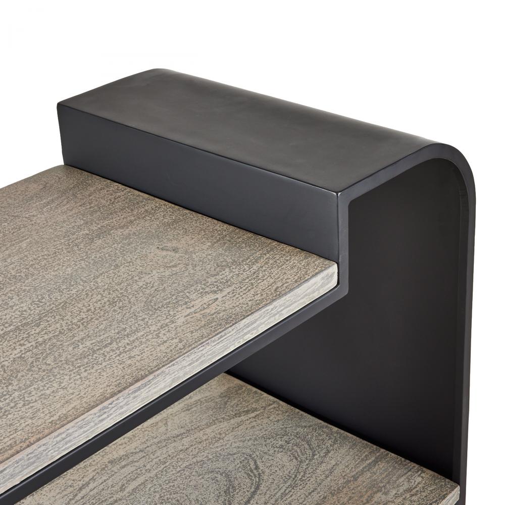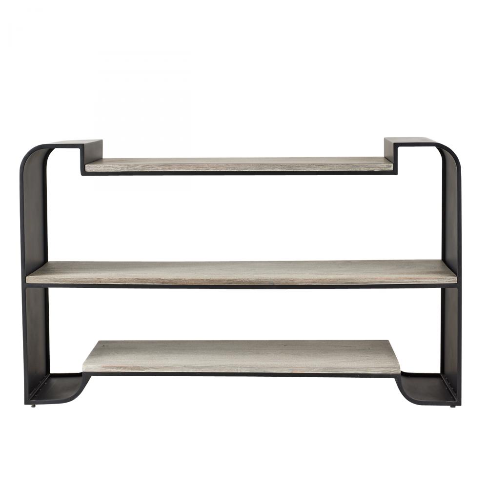 Inspired by industrial style yet equally at home in a contemporary space, a balanced etagere suspends smoke mango wood within a framework of blackened bronze iron. The shelving floats between linear and curved elements with a waterfall effect. Finish will vary.