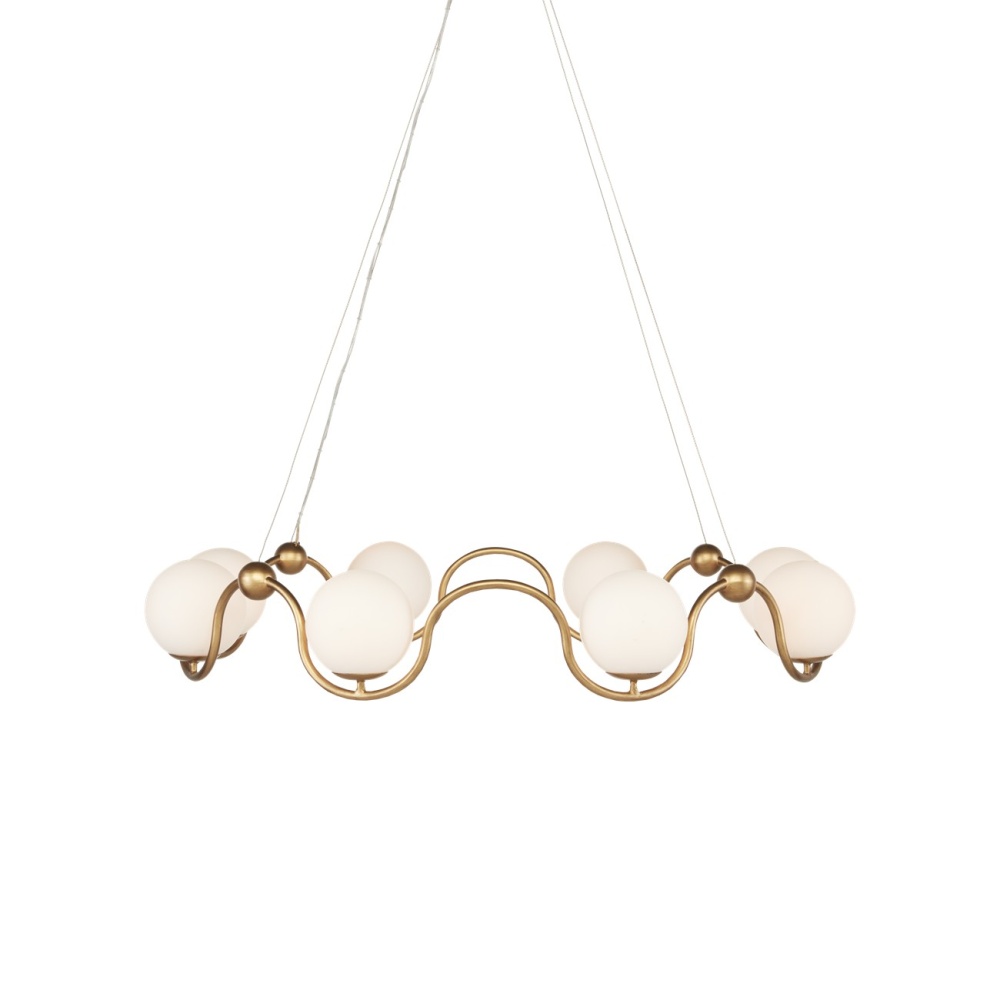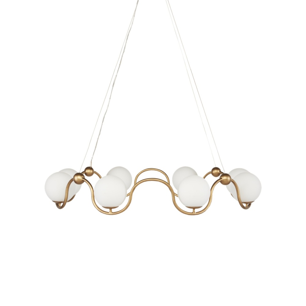 The Equilibrium Chandelier is a gold chandelier with lovely glowing globes inspired by Milano aesthetics. The way the undulant frame swirls around the opaque white glass globes allows the composition to maintain its balance perfectly. The antique brass finish on the wrought iron frame is a warm contrast. A design that is still di rigore in the great opera houses in Italy's most fashionable city of Milan, it brings with it a seriously refined aesthetic. Adjustable from 35" to 120" with use of included chain/rod kit/cable. If your space calls for a longer drop, additional chain/rods/cable is available for purchase.