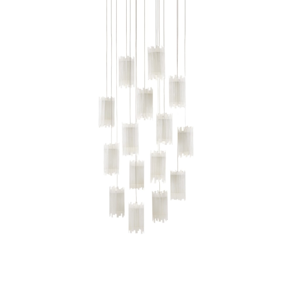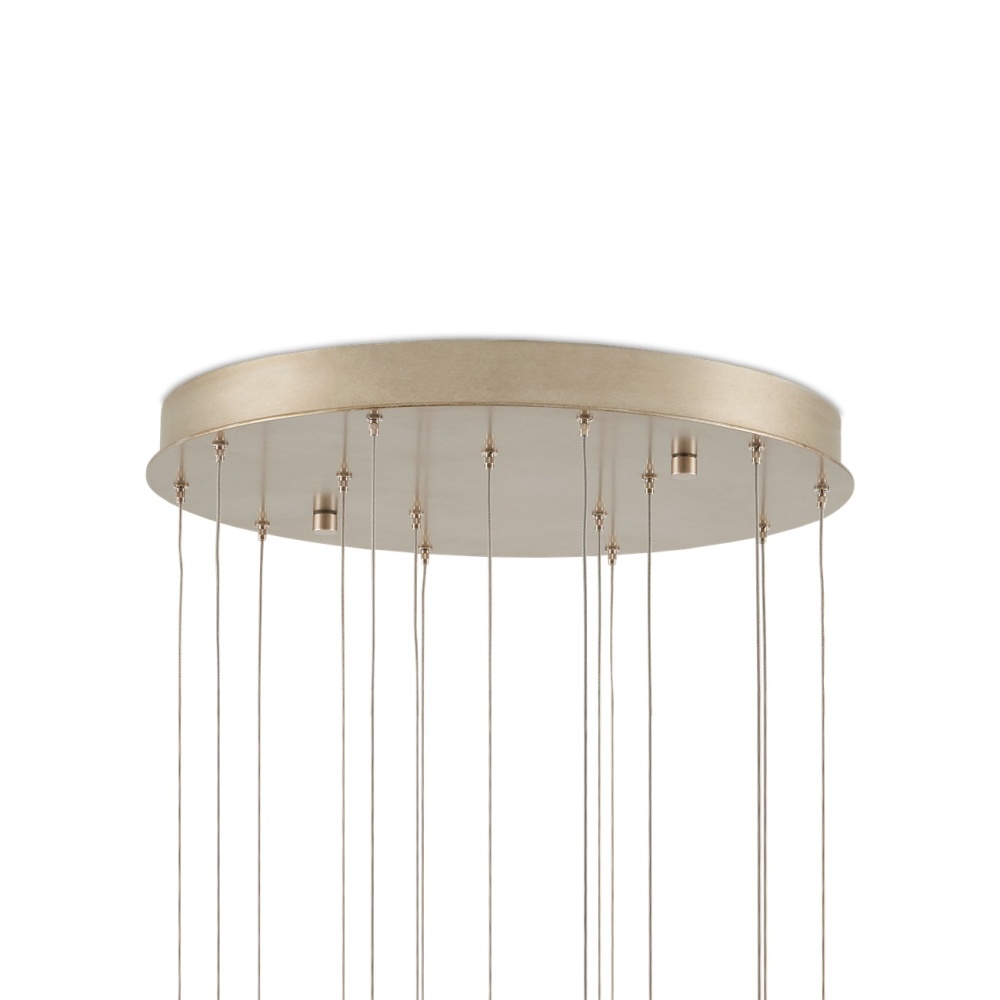 The Escenia Round 15-Light Multi-Drop Pendant has shades made of natural selenite. The ribs of the essential natural material are staggered top and bottom, which brings the shape of the shades added interest. When the lights are switched on, a beautiful glow is created by the crystal bars. The canopy of this piece is luminous in a painted silver finish. This fixture is among Currey & Company's multi-drop pendant collection, which includes multiple configurations.
