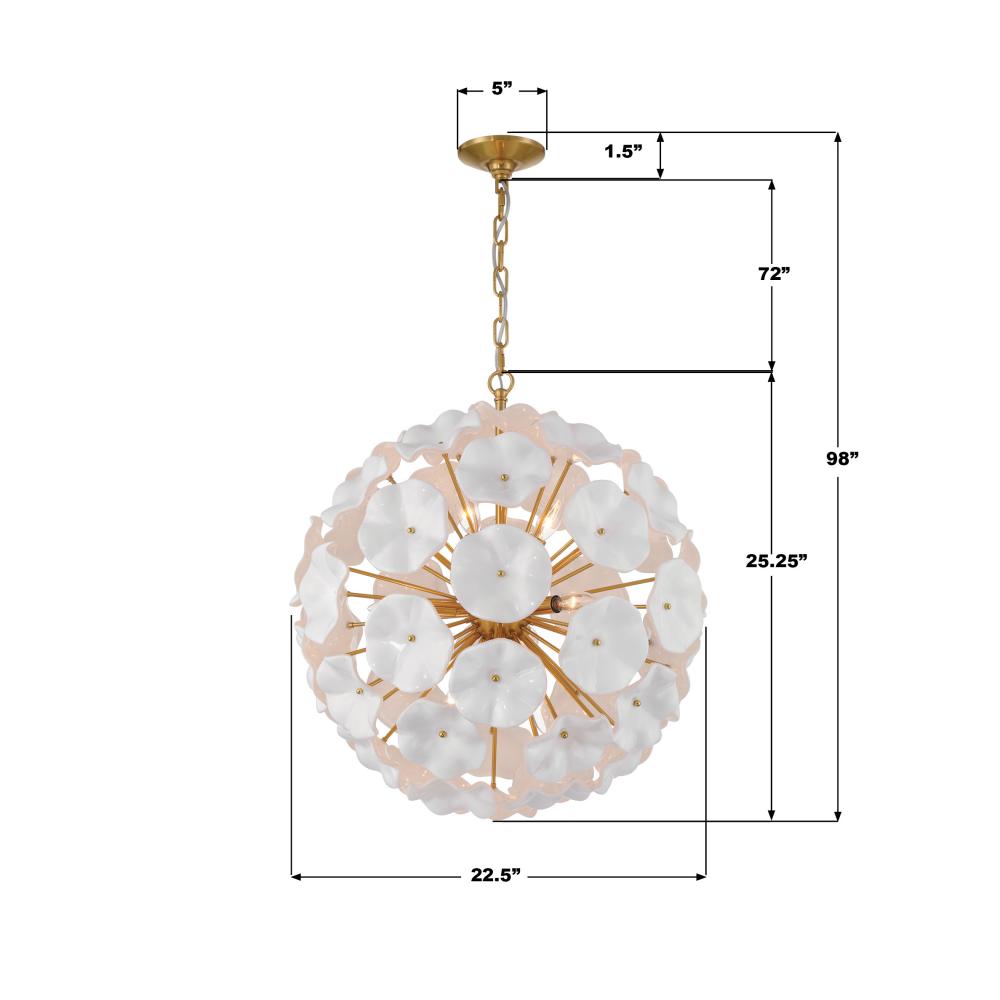 The Esme collection is a modern take on the iconic Sputnik design, blending vintage sophistication with a fresh, dynamic twist. Its spherical core anchors an array of brass rods extending outward, culminating in hand-blown art glass shaped like delicate flower petals. This striking piece transforms a room, offering a different visual experience whether it's illuminated or not—sophisticated and bold when off, subtly whimsical and glowing with warmth when on. Esme's timeless charm and playful elegance stand out in any space.