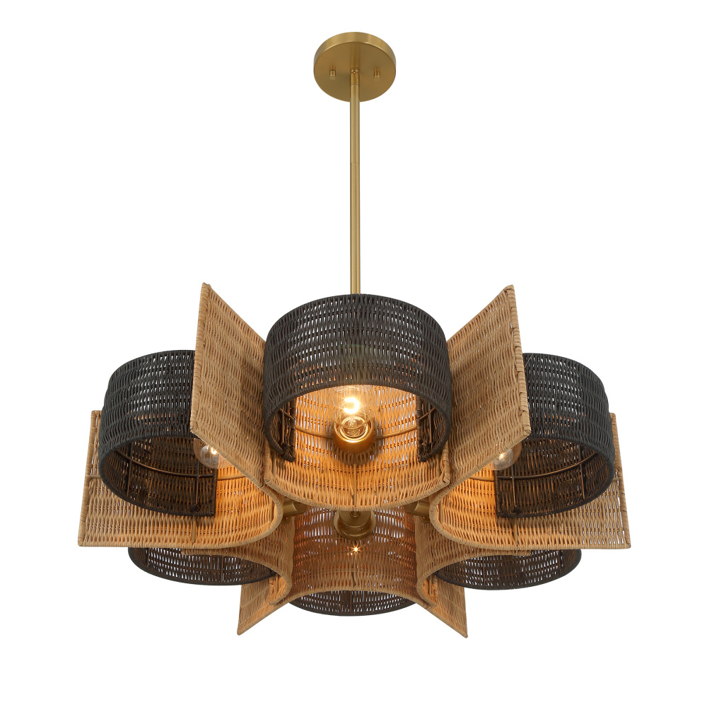 The Savoy House Espacio 6-light pendant opens like a blooming flower with sweeping petals handcrafted from natural and black rattan for a stunning two-tone effect. The Warm Brass finish heightens the warmth of the rattan and adds a rich, radiant glow. Espacio is 28" wide and has an adjustable height ranging from 13" to 67". It uses six standard size bulbs of up to 60 watts per bulb. Bulbs not included. Comes with four 12" downrods and one 6" downrod.