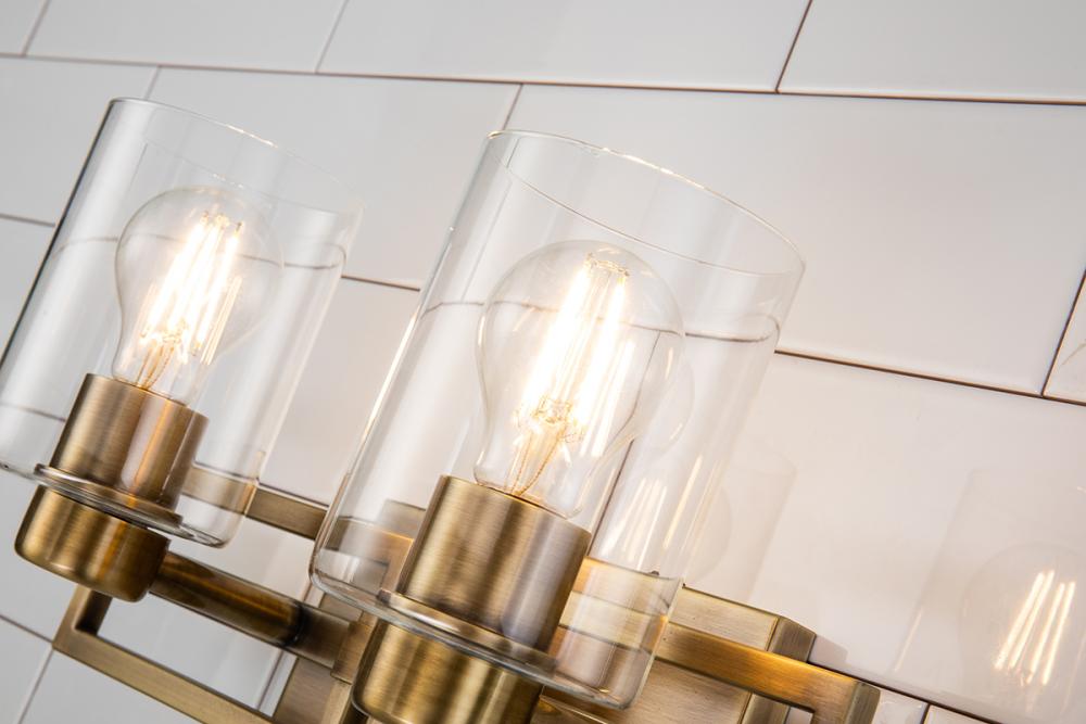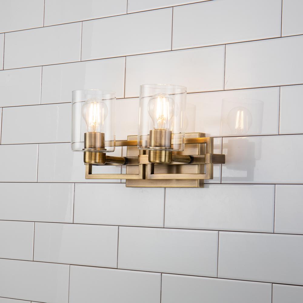 A 15" vanity light in brushed aged brass with rectangular lines and two curved cylinder shades. Mounts up or down, ideal for over-mirror use with mid-century charm.